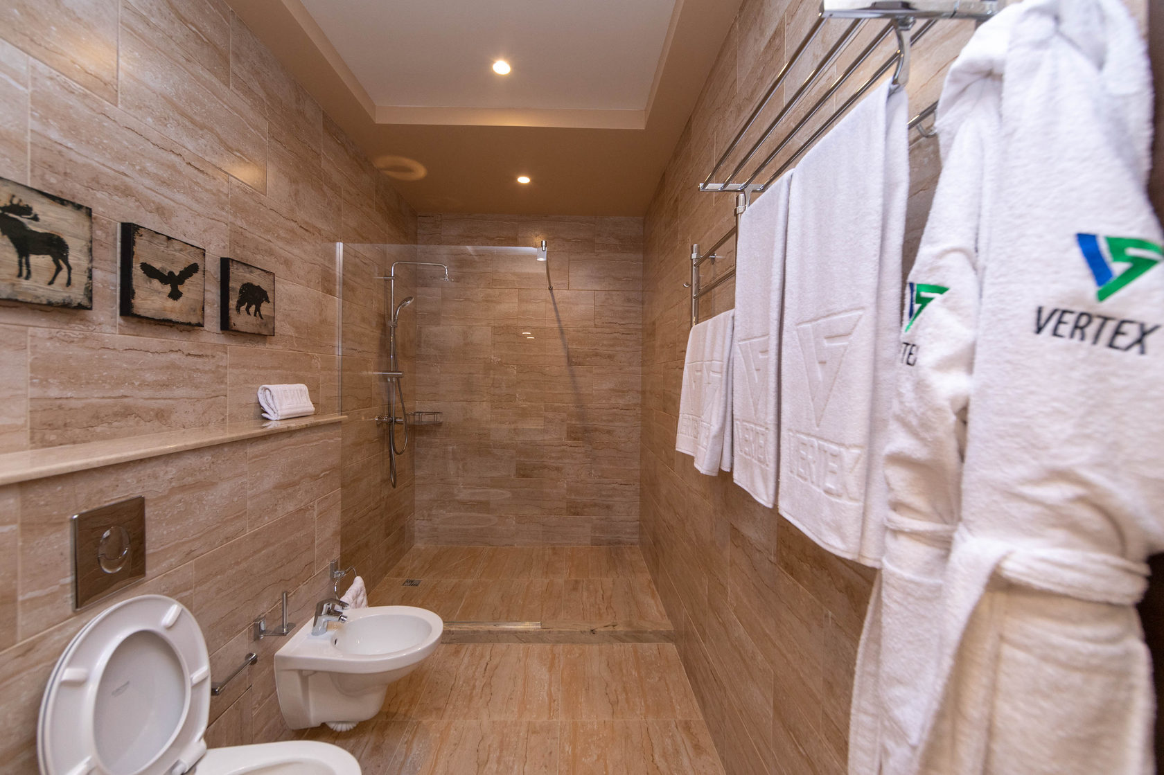 с душем , тапочки , туалетные принадлежности , фен , халат