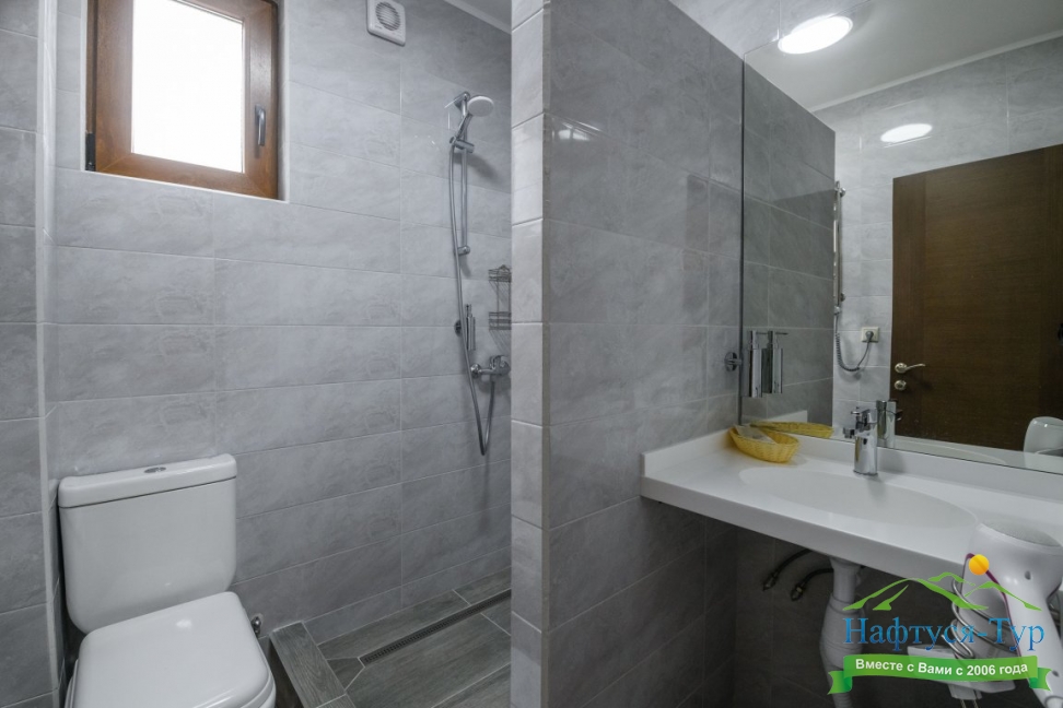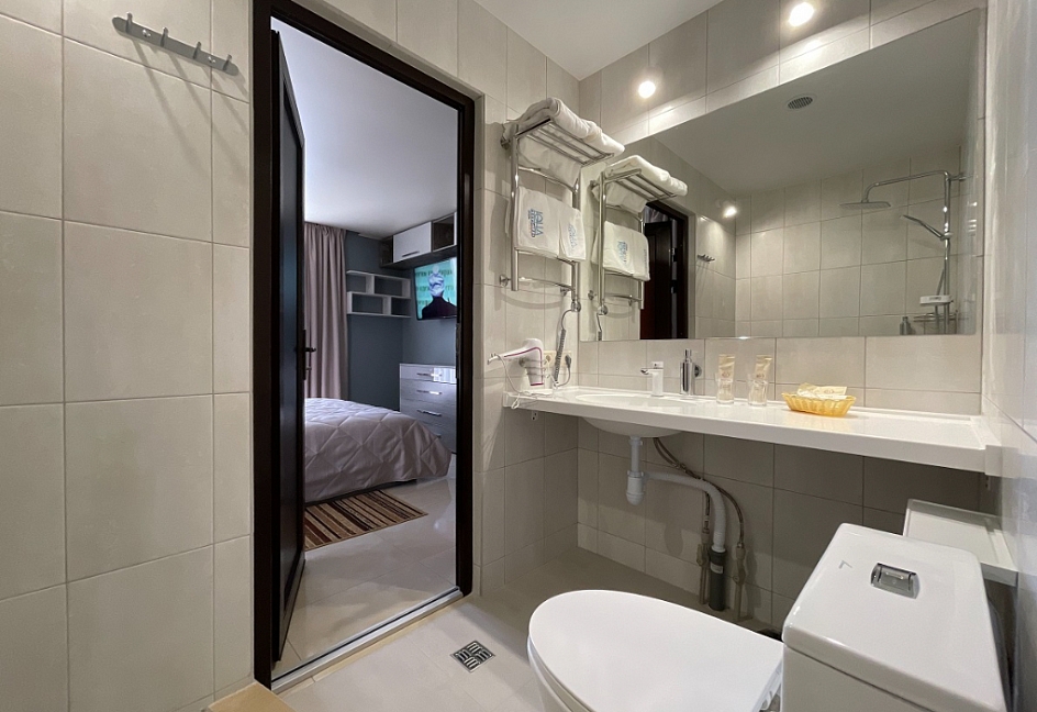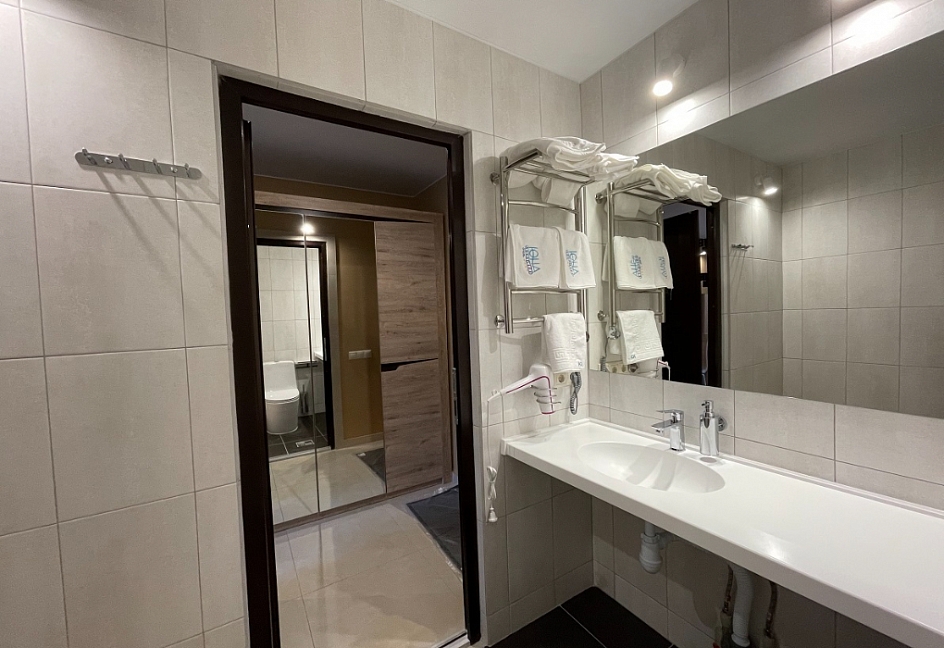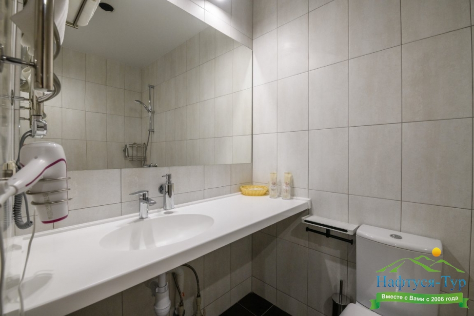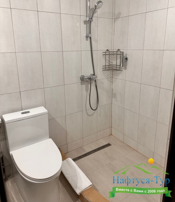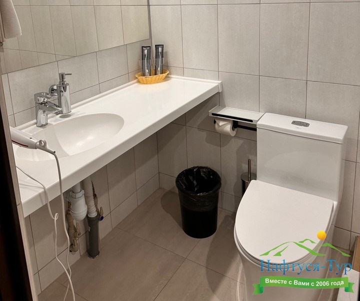 с душем, тапочки, туалетные принадлежности, фен, халат
