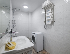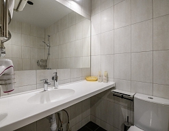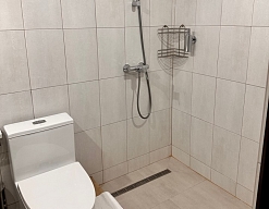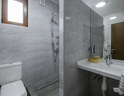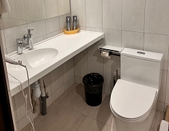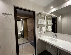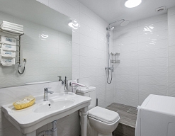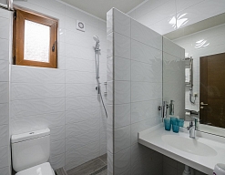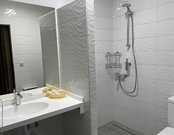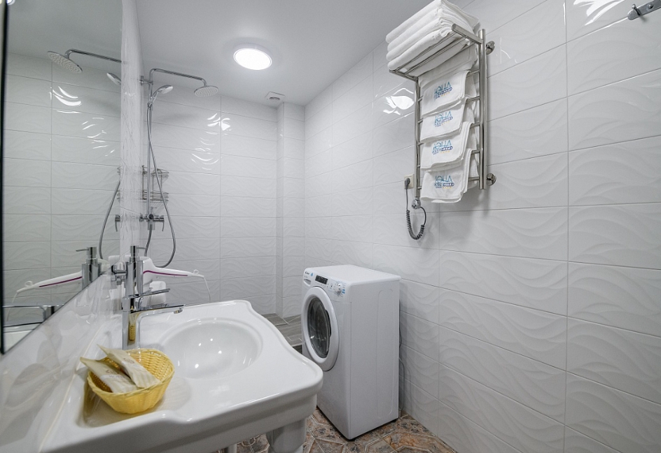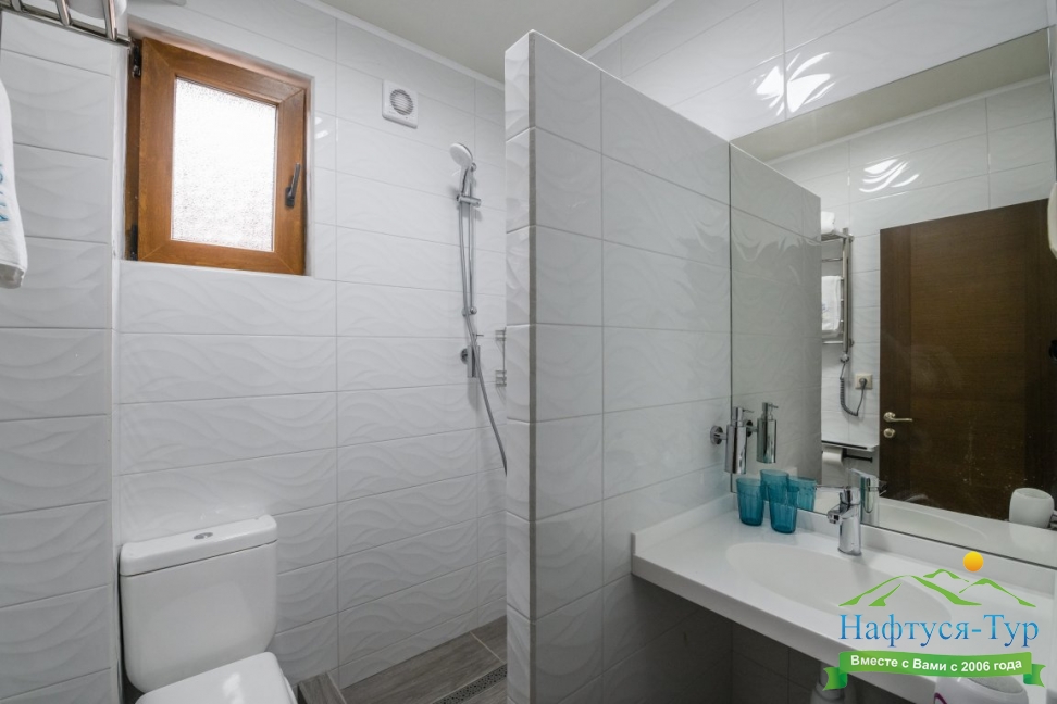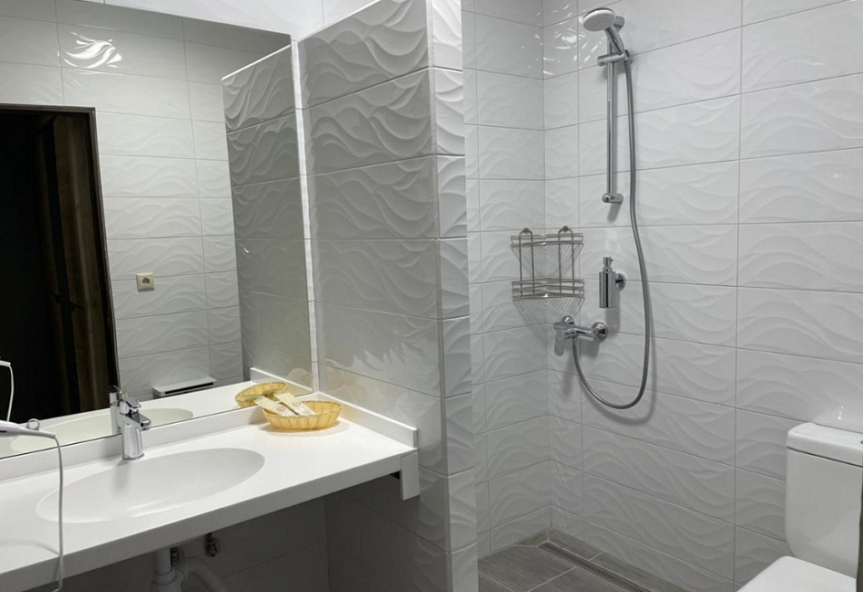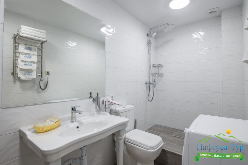 с душем, тапочки, туалетные принадлежности, фен, халат