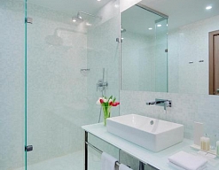 с душевой кабиной, тапочки, туалетные принадлежности, фен, халат