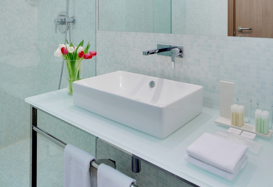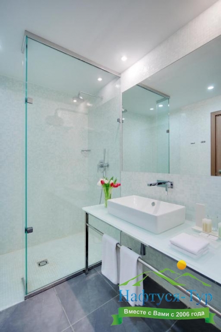 с душем, тапочки, туалетные принадлежности, фен, халат