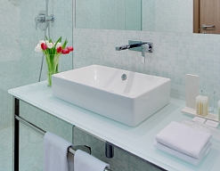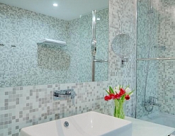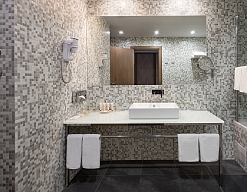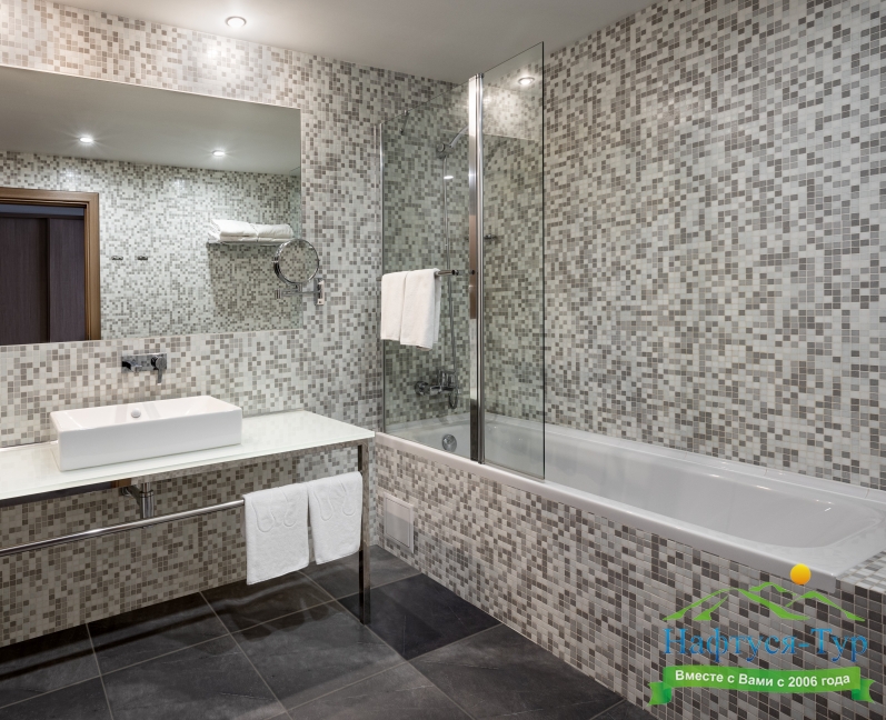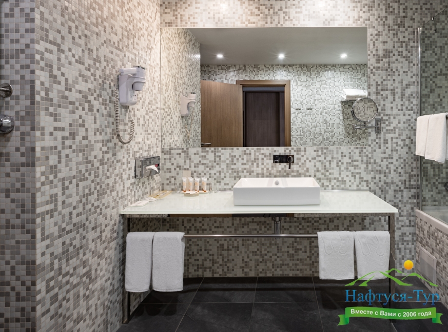 с ванной, тапочки, туалетные принадлежности, фен, халат