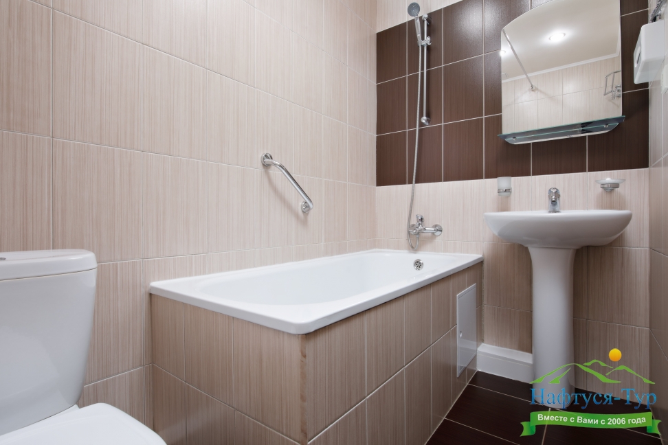 с ванной, тапочки, туалетные принадлежности, фен, халат