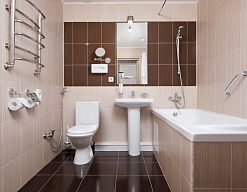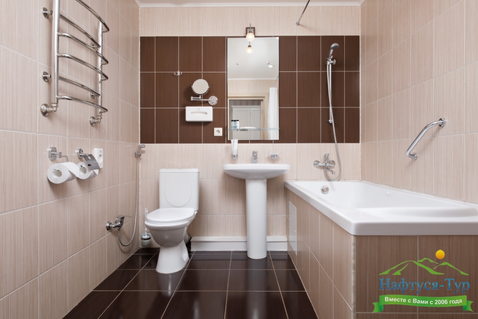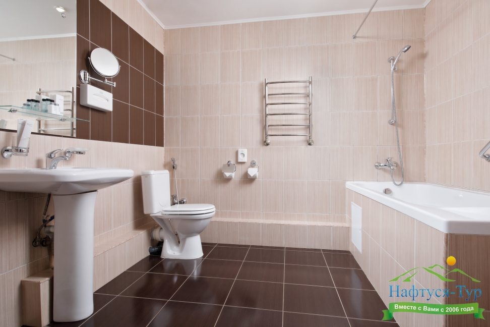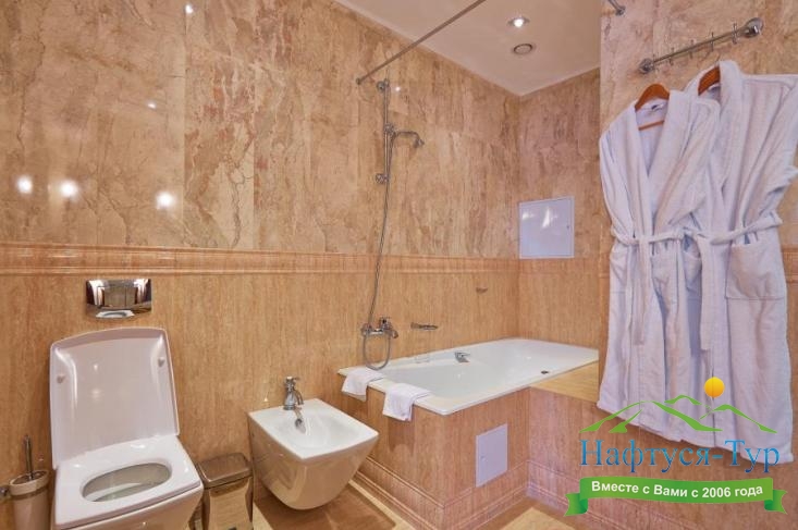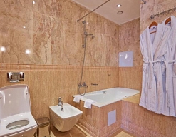 биде, с ванной, тапочки, туалетные принадлежности, фен, халат