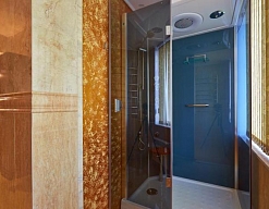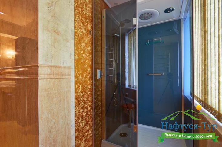с душем, тапочки, туалетные принадлежности, фен, халат