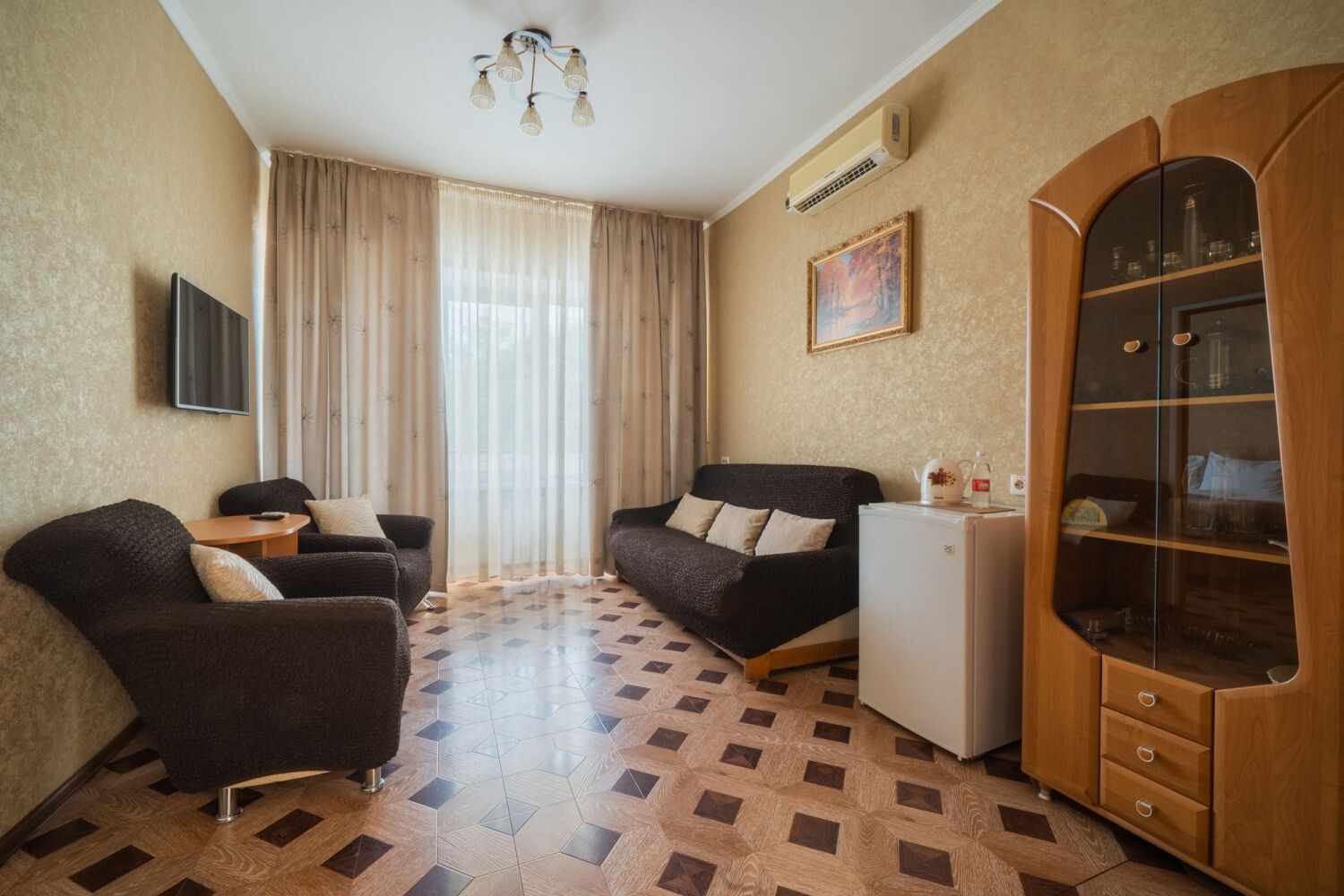 телевизор, холодильник, чайный набор посуды, электрочайник