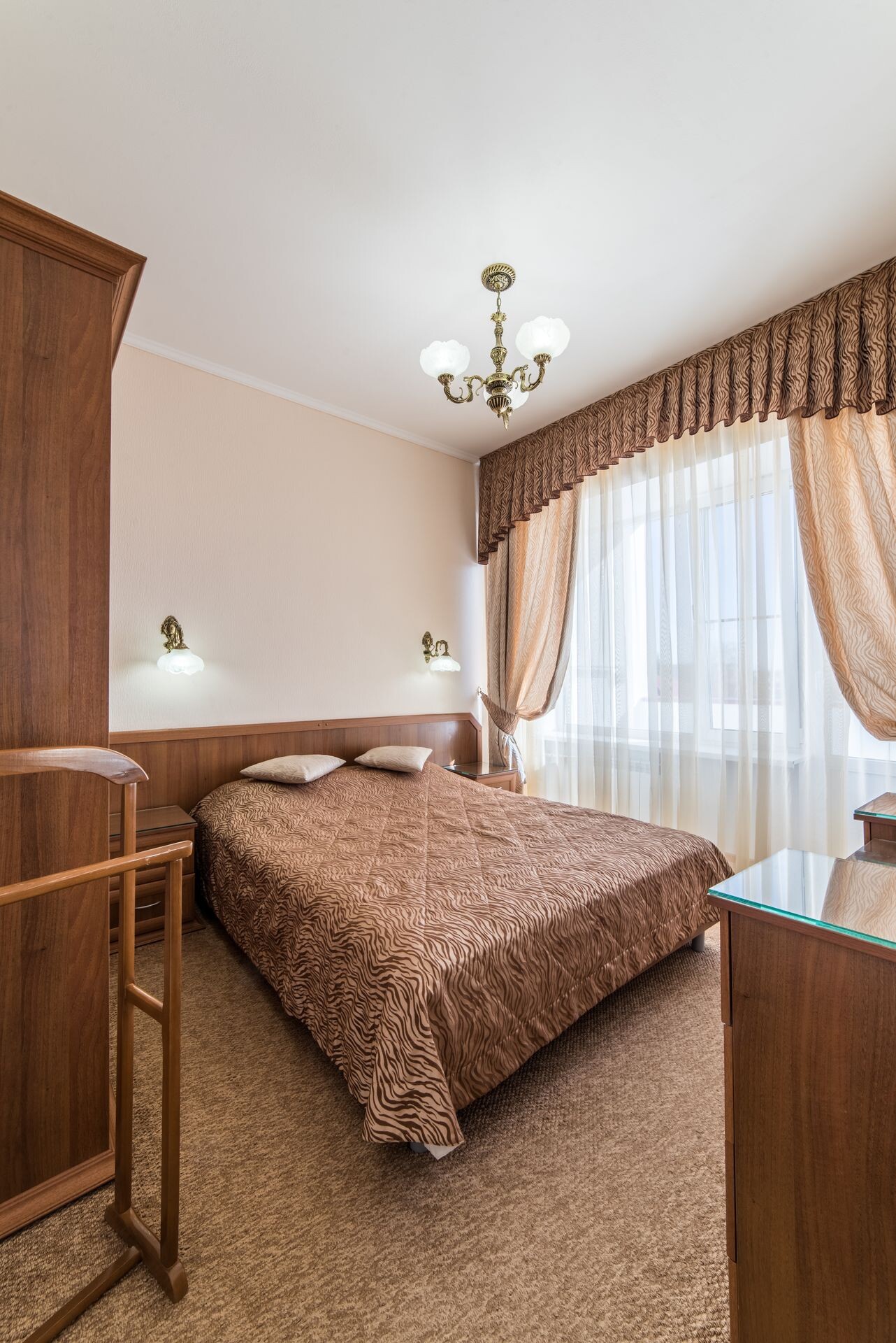 вешалка, зеркало, кровать полутороспальная, прикроватная тумбочка, стол, стул, шкаф