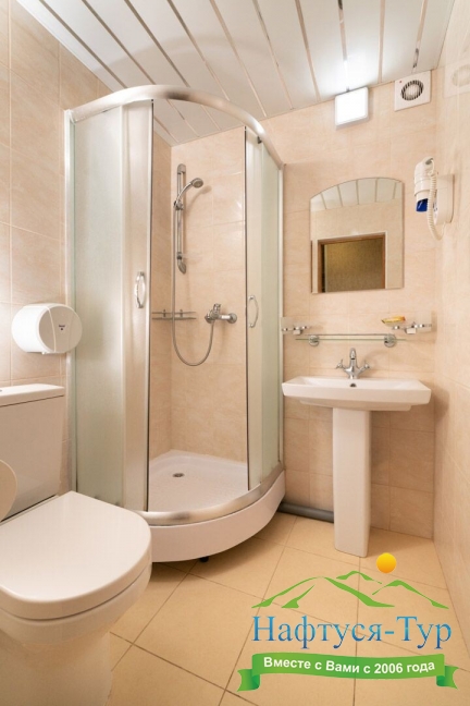 с душевой кабиной, туалетные принадлежности, фен