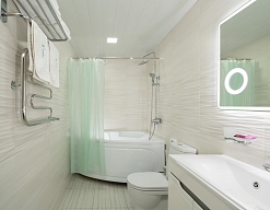с ванной, тапочки, туалетные принадлежности, фен