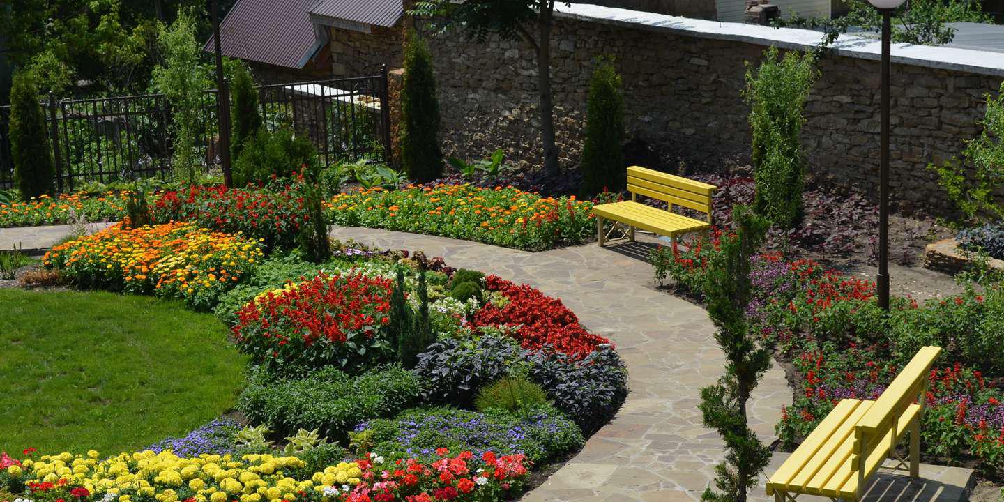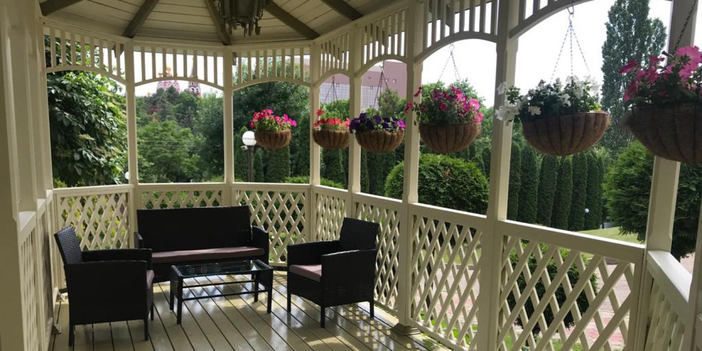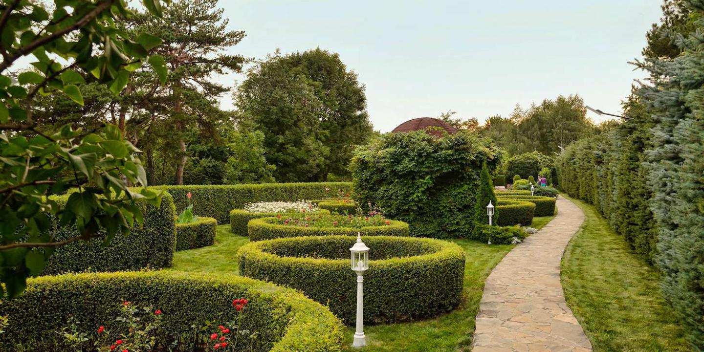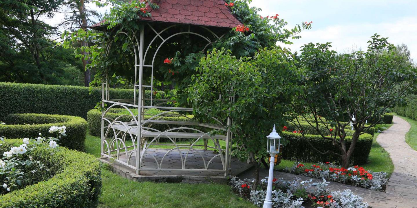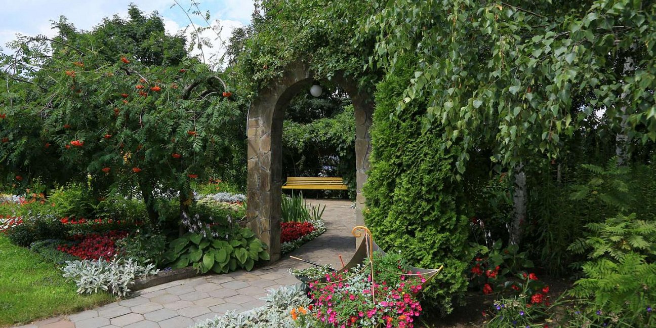 Ландшафтный дизайн территории. "Кругозор" окружен живописными садами и аллеями, создавая уникальную атмосферу для прогулок и отдыха на свежем воздухе.