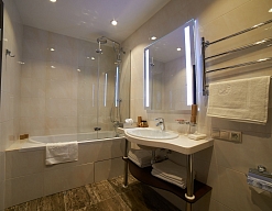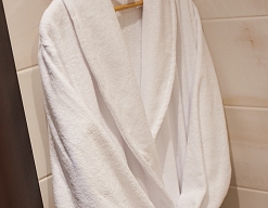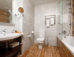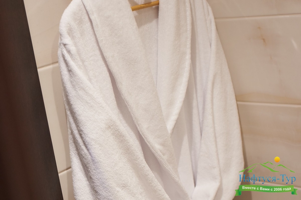 с ванной, тапочки, туалетные принадлежности, фен, халат