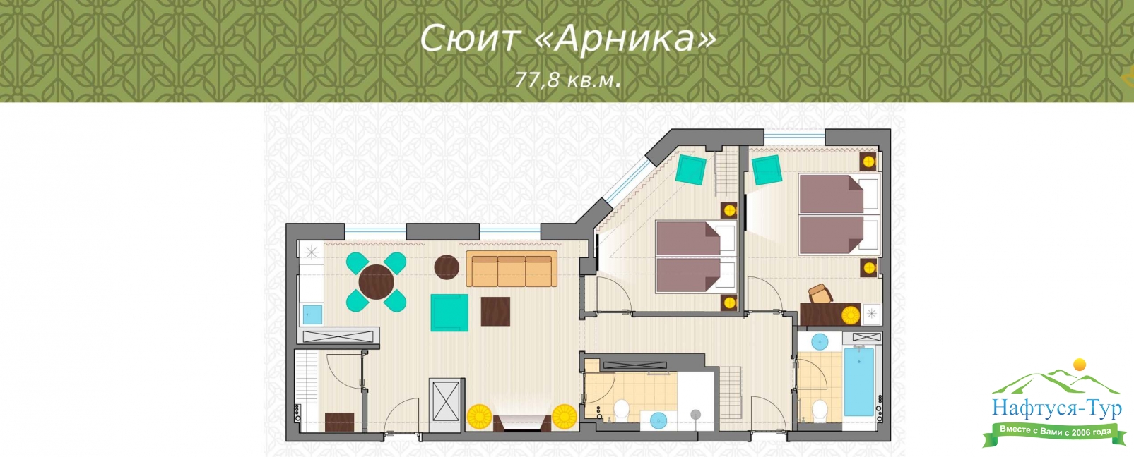 Комфортабельные номера различных категорий. От стандартов до люксов, каждый номер санатория "Арника" предоставляет простор и уют для вашего спокойного отдыха. Мы стремимся создать для вас домашнюю атмосферу вдали от дома.