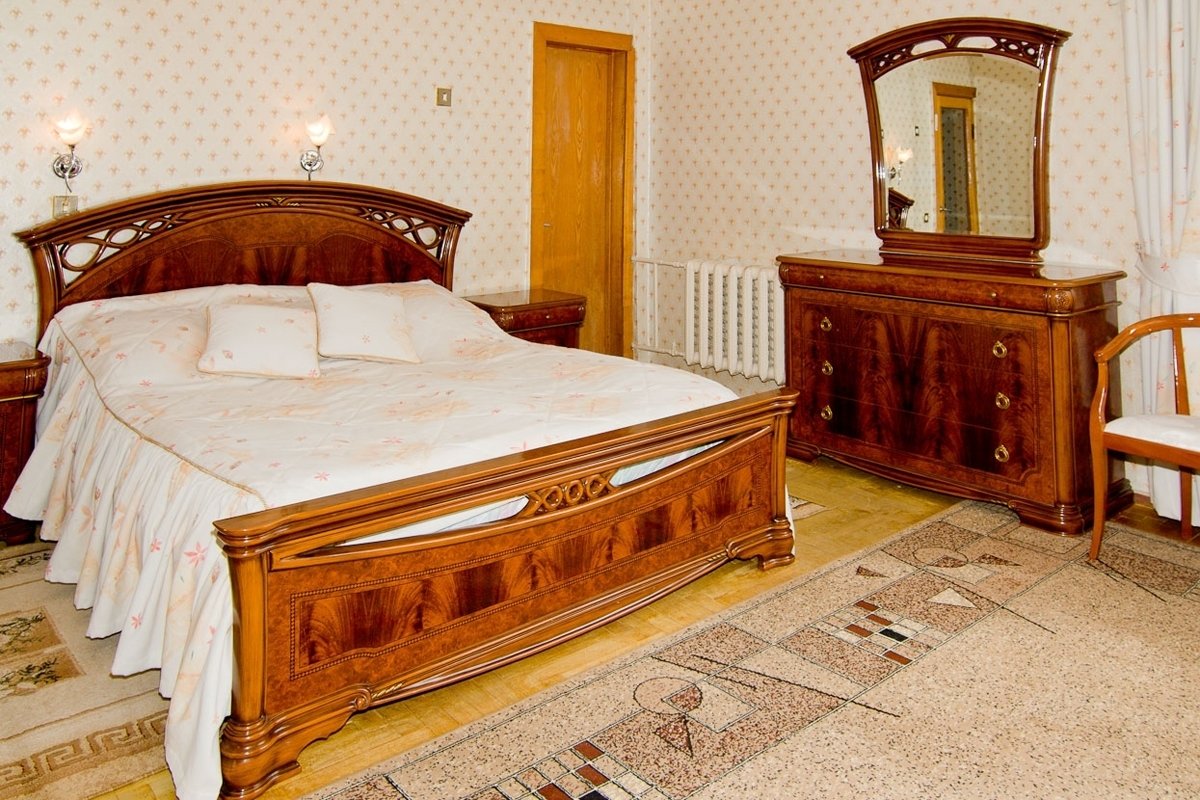 диван, зеркало, комод, кровать двуспальная, набор мягкой мебели, прикроватные тумбочки, стол, стулья, шкаф, шкаф для посуды