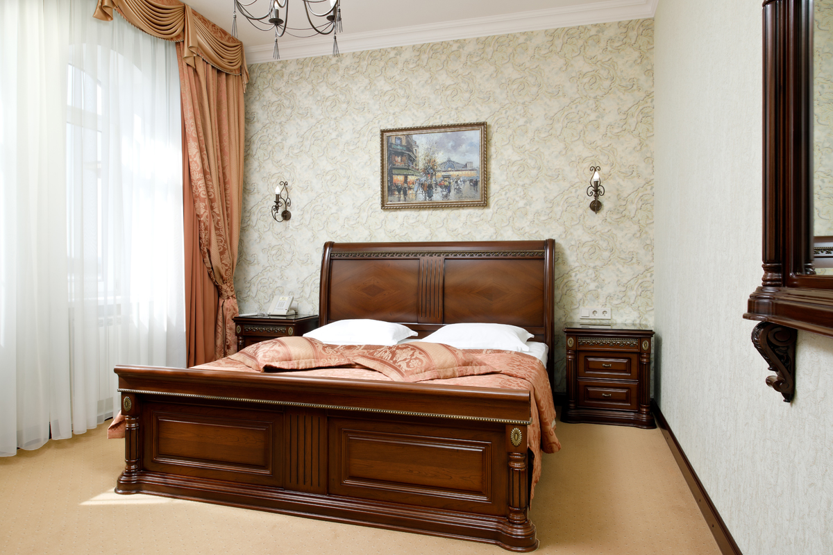 вешалка, диван, зеркало, комод, кровать двуспальная, прикроватные тумбочки, стол, стулья, шкаф