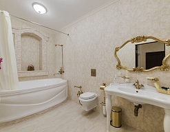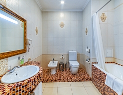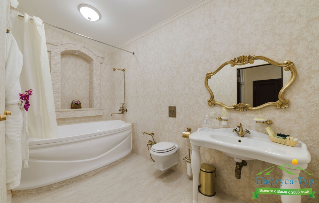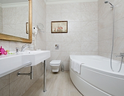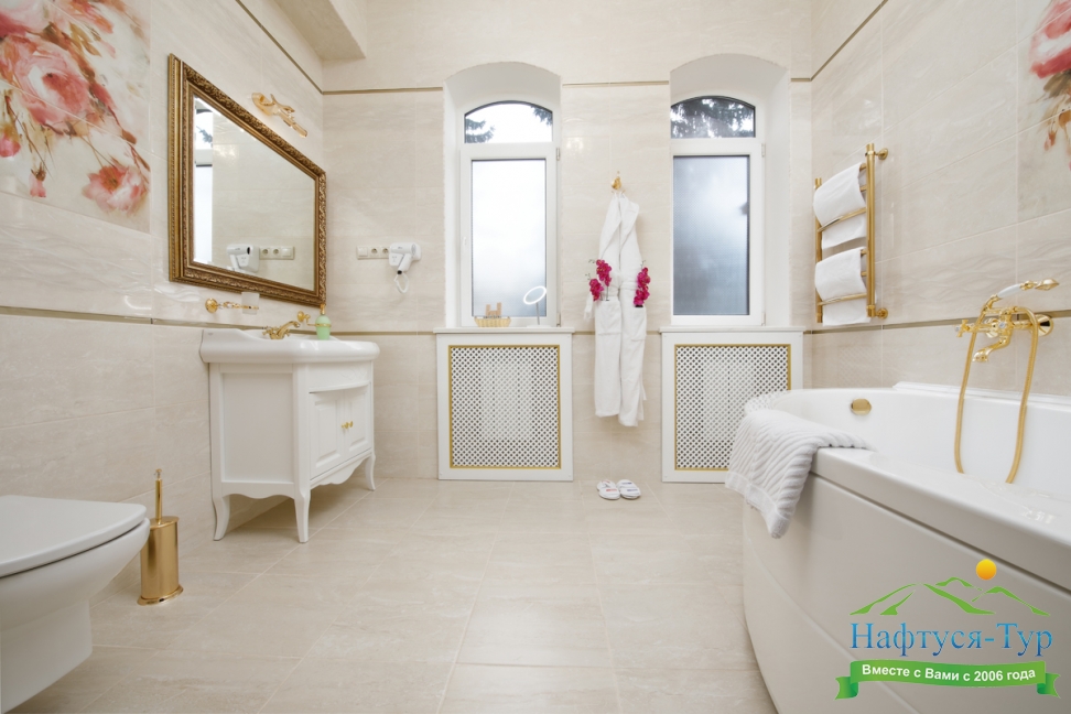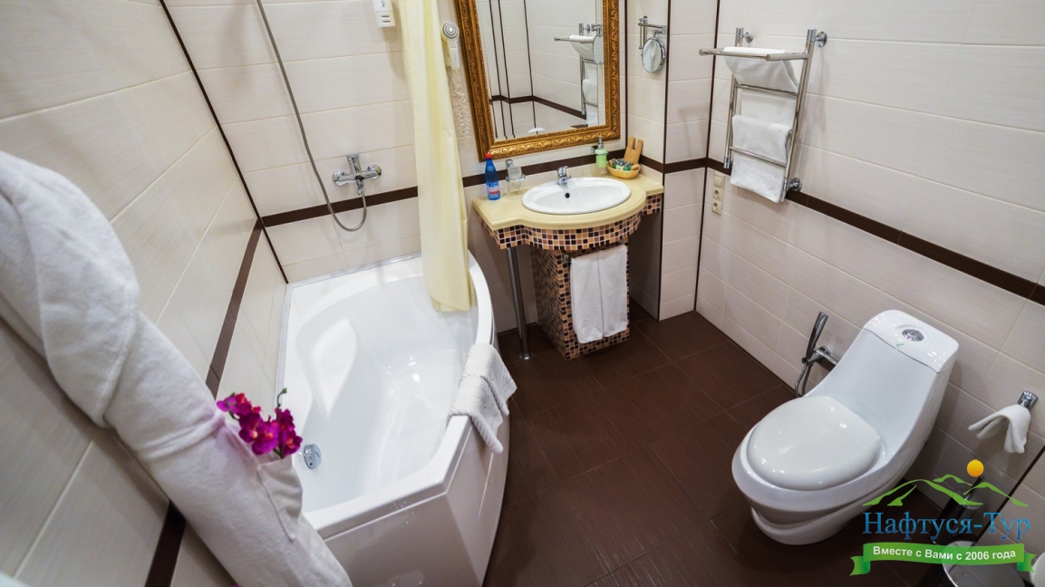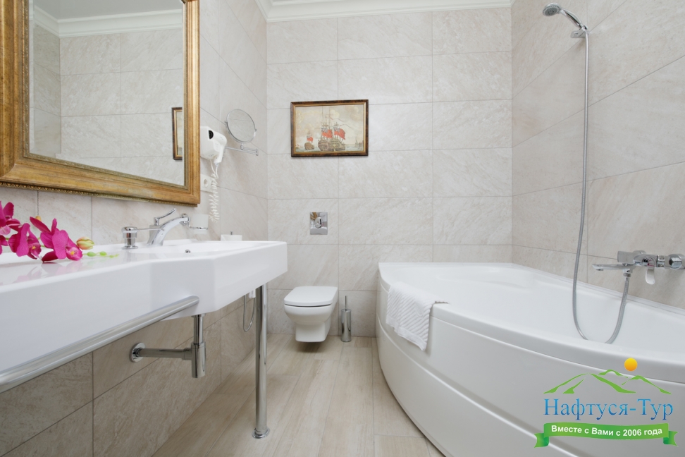 с ванной, тапочки, туалетные принадлежности, фен, халат