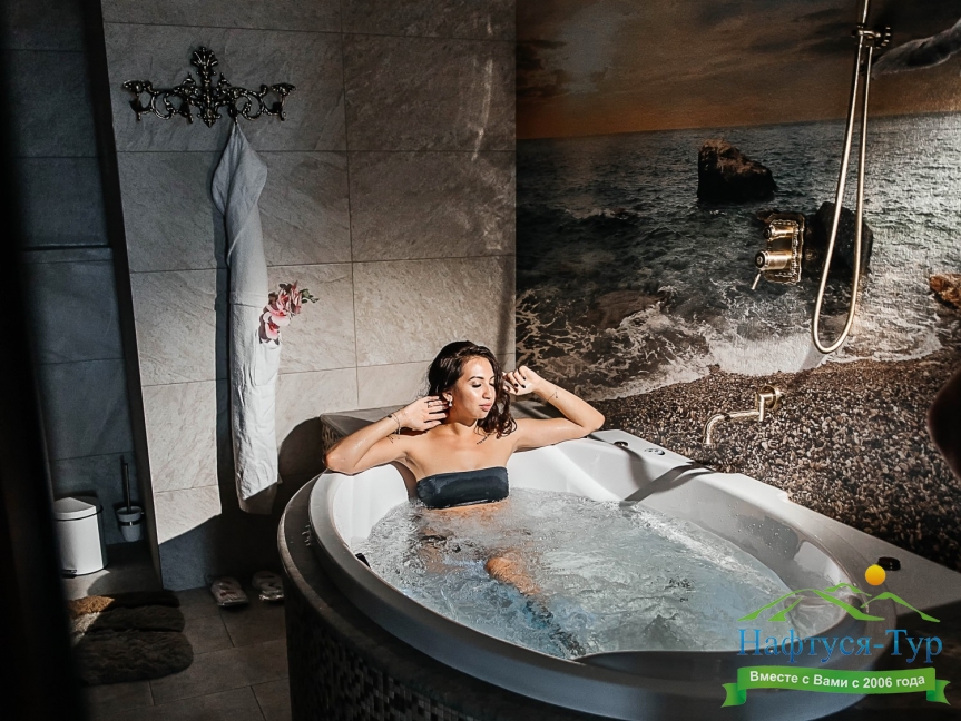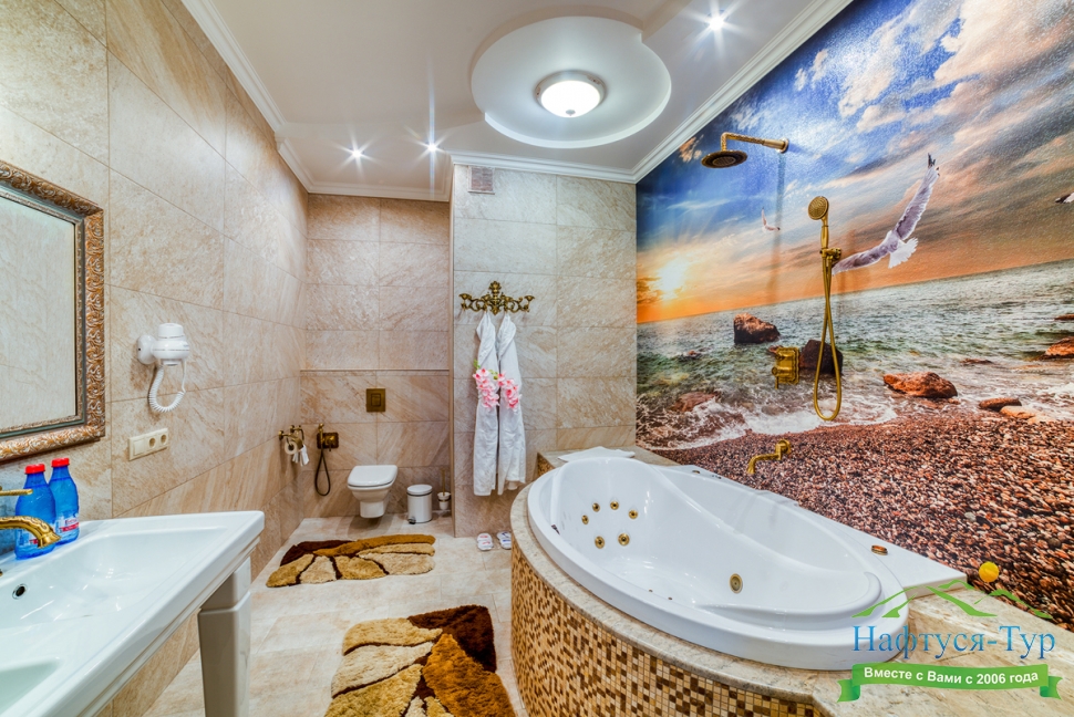 с джакузи, тапочки, туалетные принадлежности, фен, халат