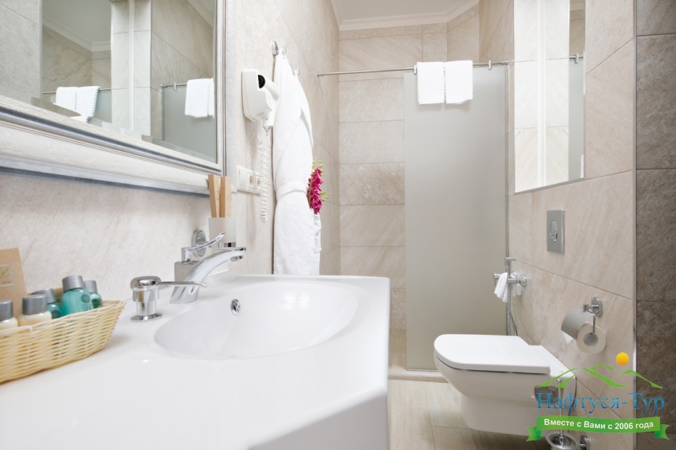 с душем, туалетные принадлежности, фен, халат