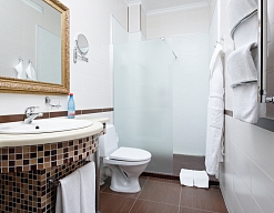 с ванной или душевой кабиной, тапочки, туалетные принадлежности, фен, халат