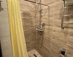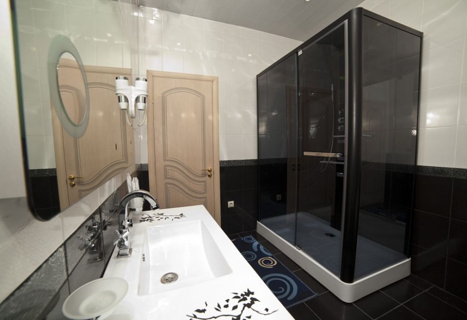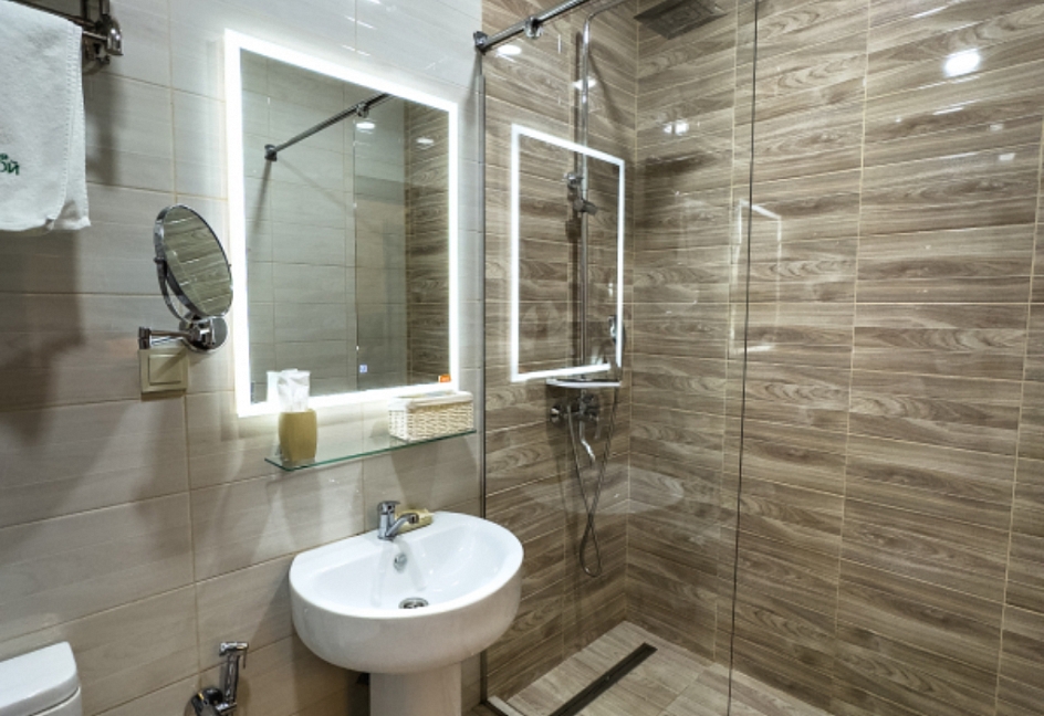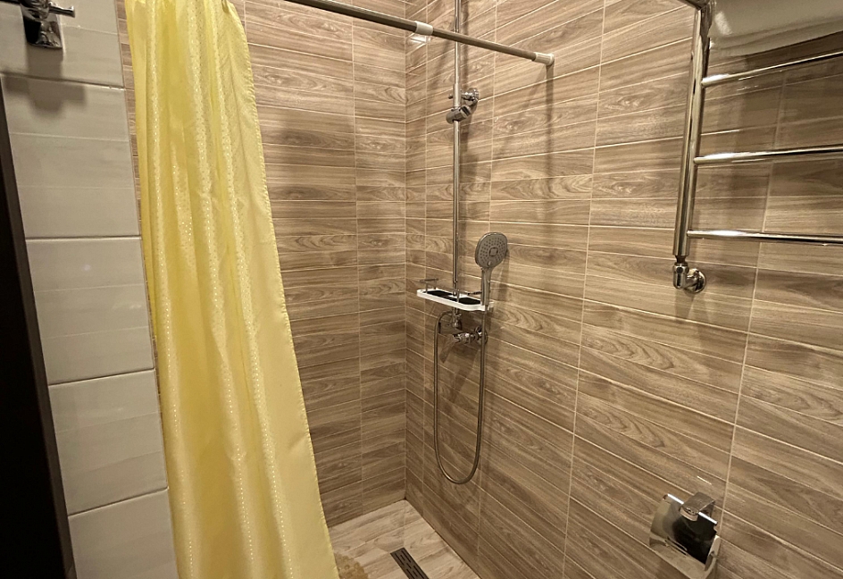 с душем, тапочки, туалетные принадлежности, фен, халат