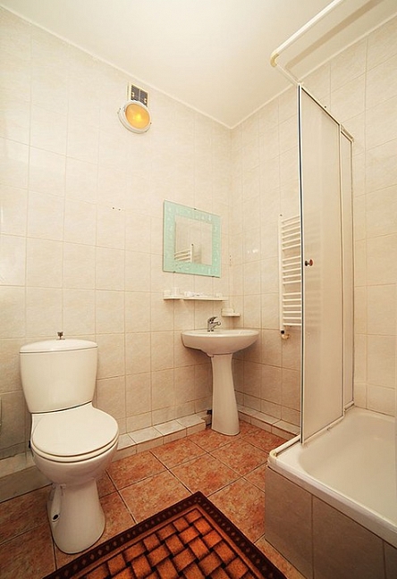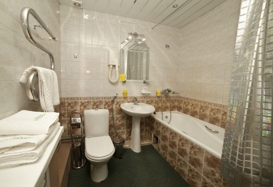 с ванной, тапочки, туалетные принадлежности, фен, халат