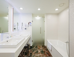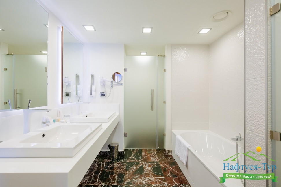 с душем или ванной, тапочки, туалетные принадлежности, фен, халат
