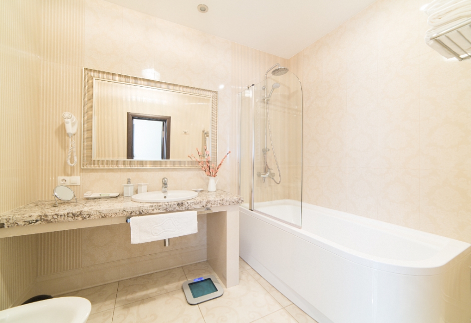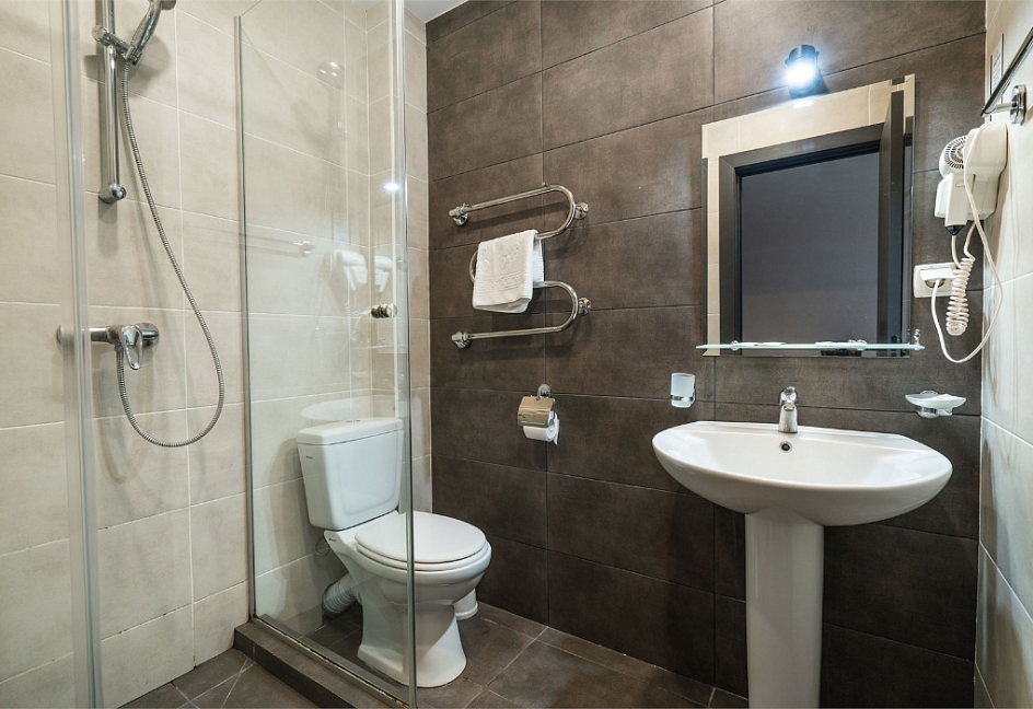 с душем, тапочки, туалетные принадлежности, фен