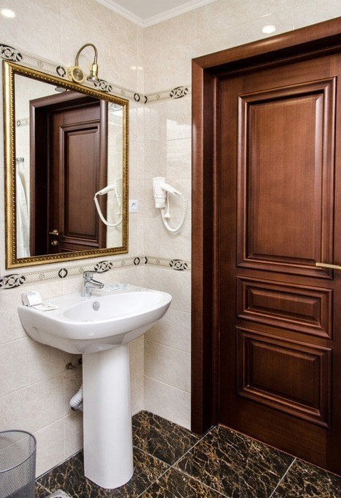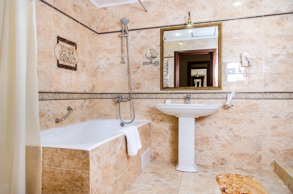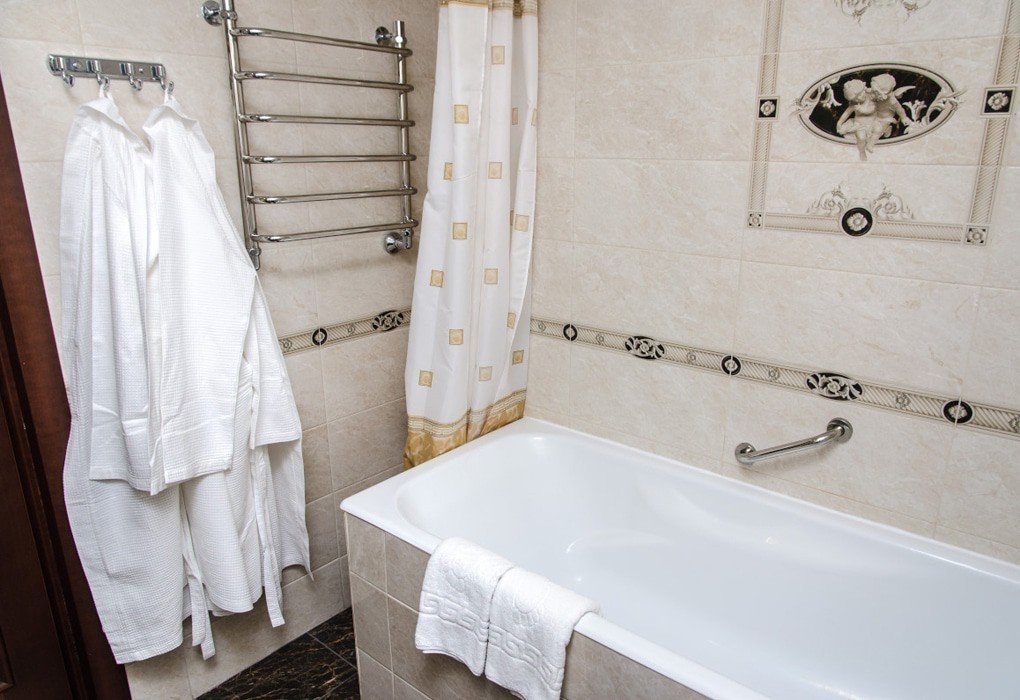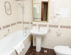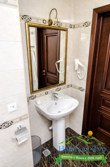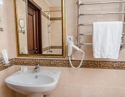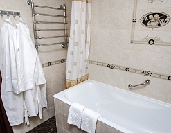 с ванной, с душем, тапочки, туалетные принадлежности, фен, халат