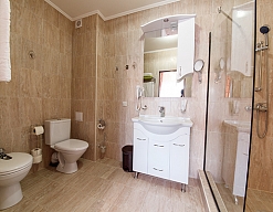 с душевой кабиной, тапочки, туалетные принадлежности, фен, халат