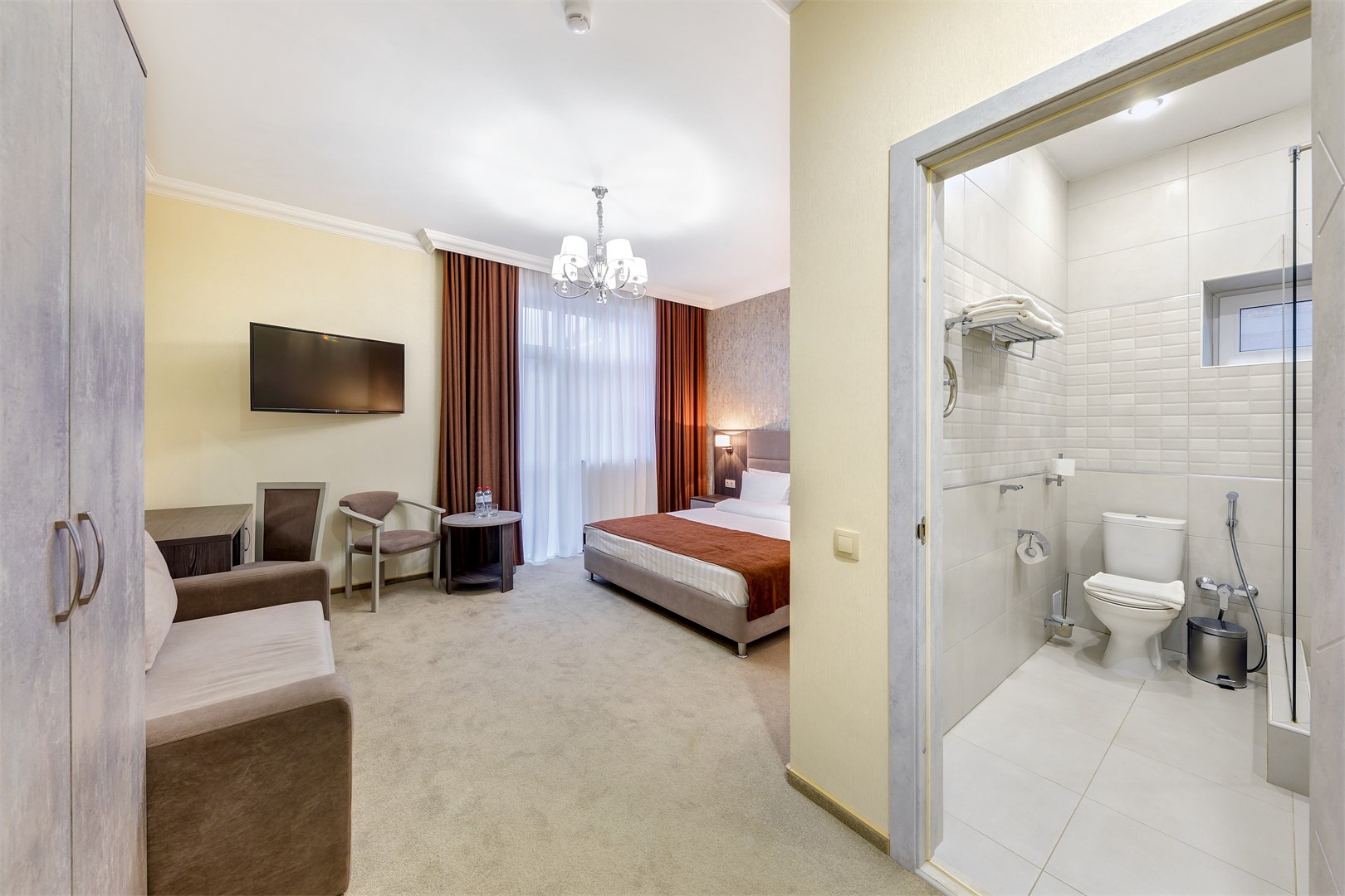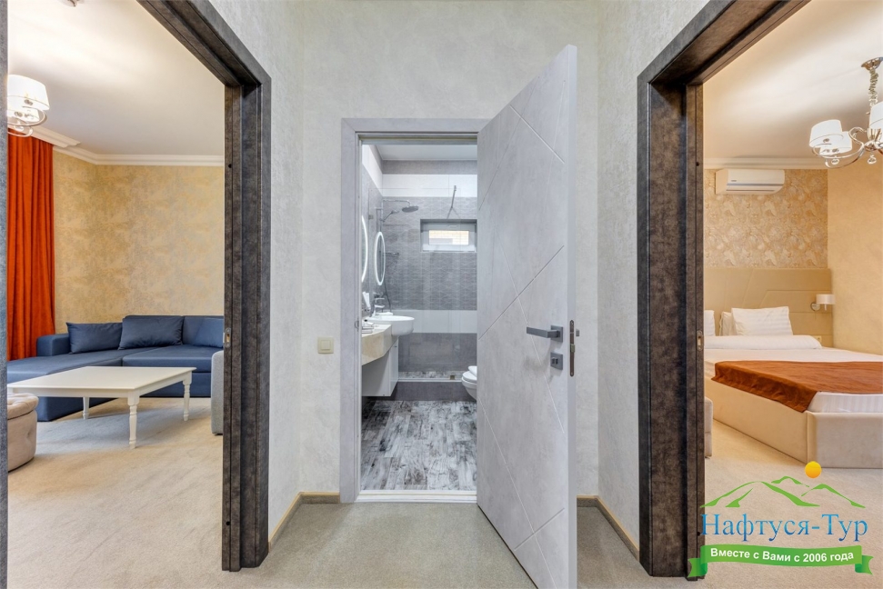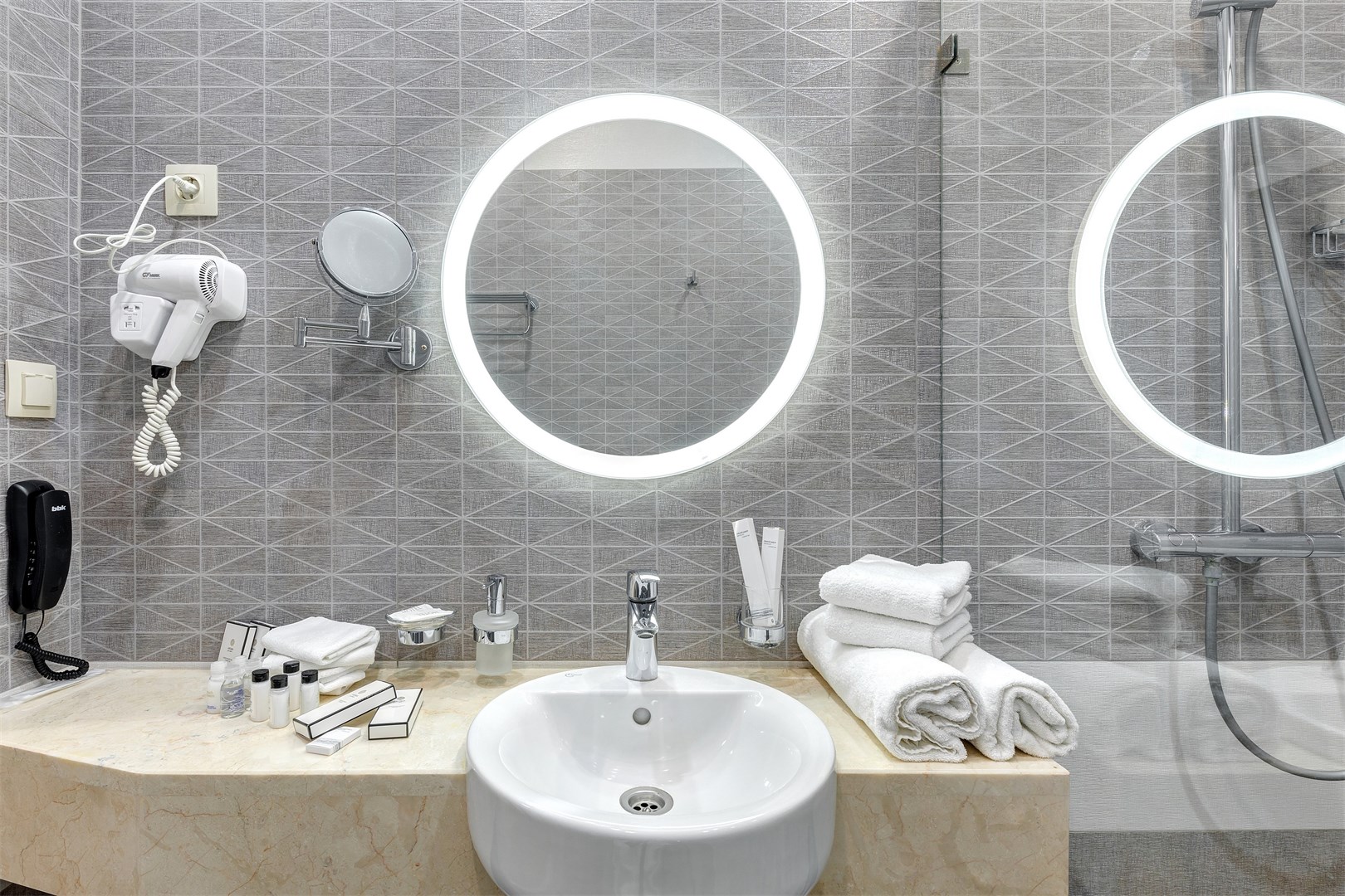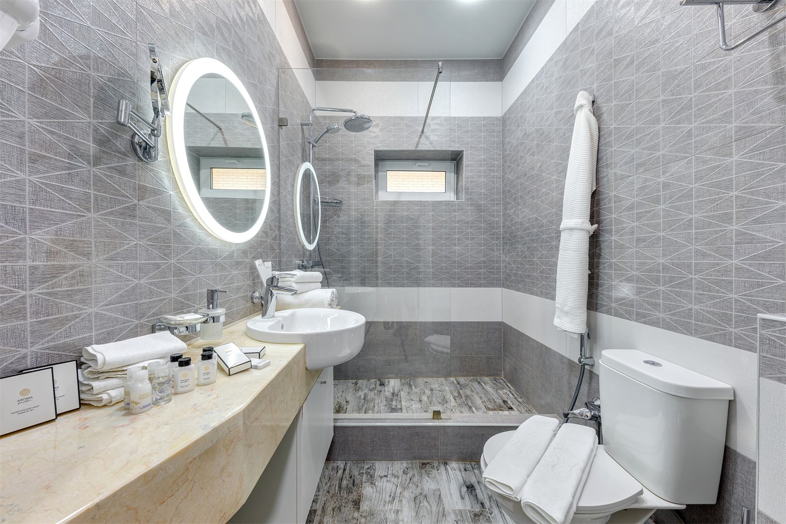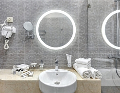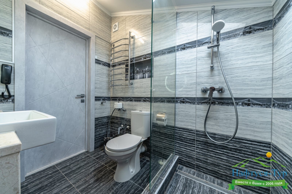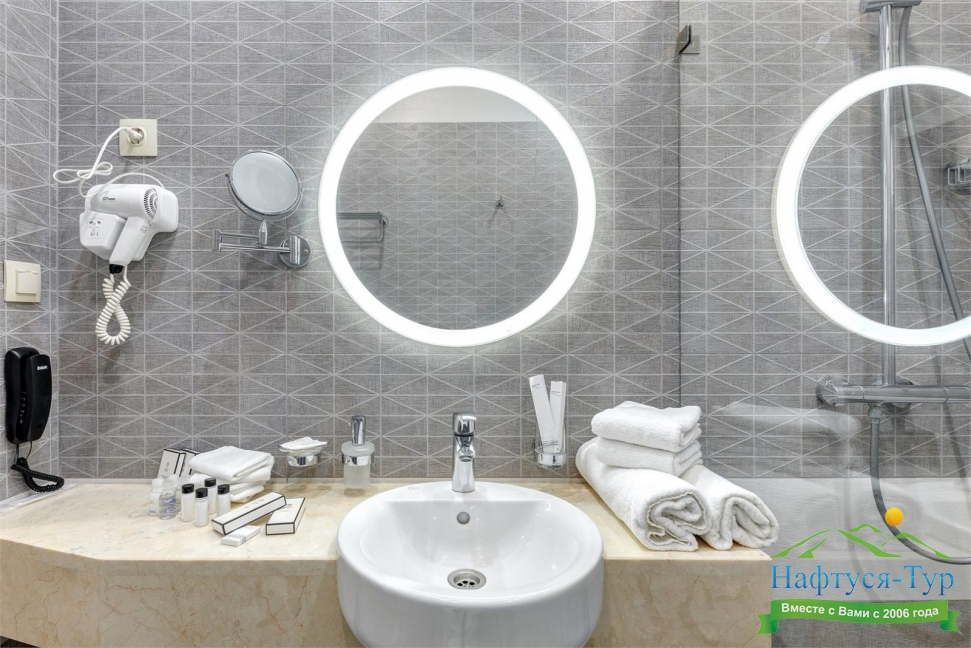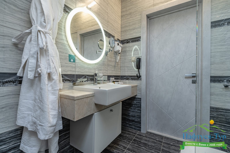 с душем, тапочки, туалетные принадлежности, фен, халат