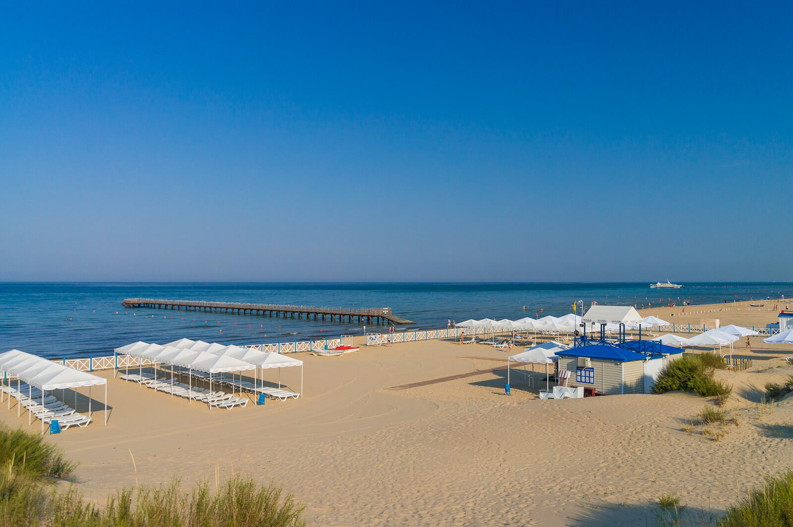 Огромный собственный пляж курорта оборудован всем необходимым для комфортного отдыха наших гостей — зонты, шезлонги, теневые навесы, раздевалки и души.1000 метров пляжа