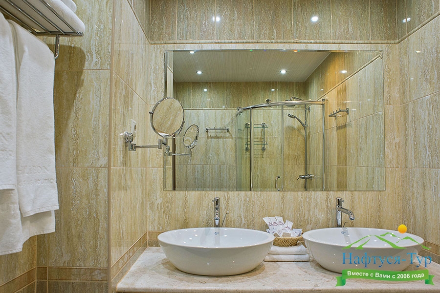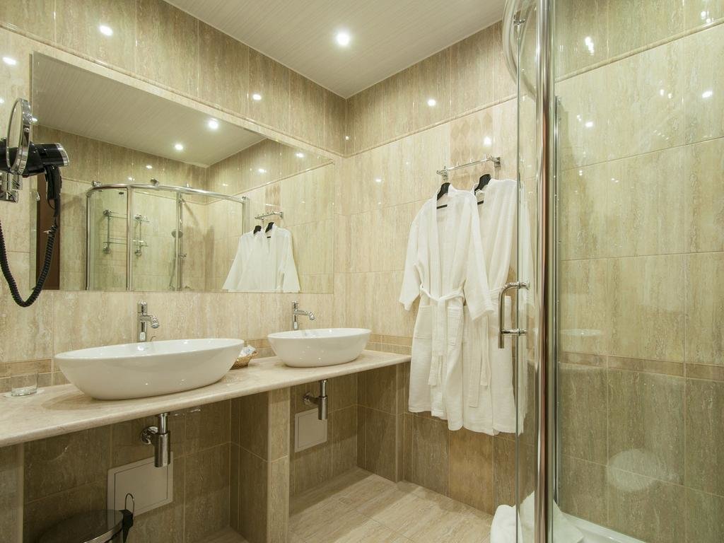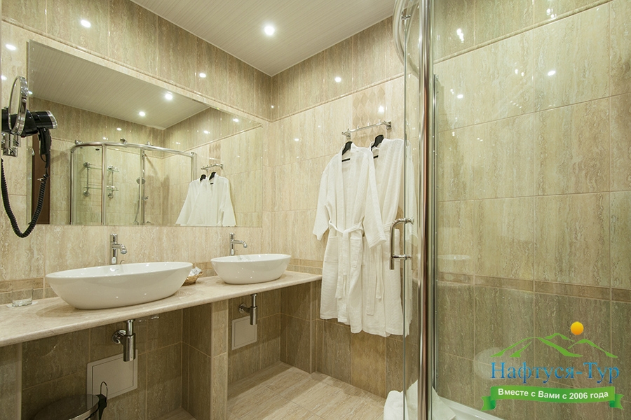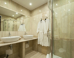 с душевой кабиной, тапочки, туалетные принадлежности, фен, халат