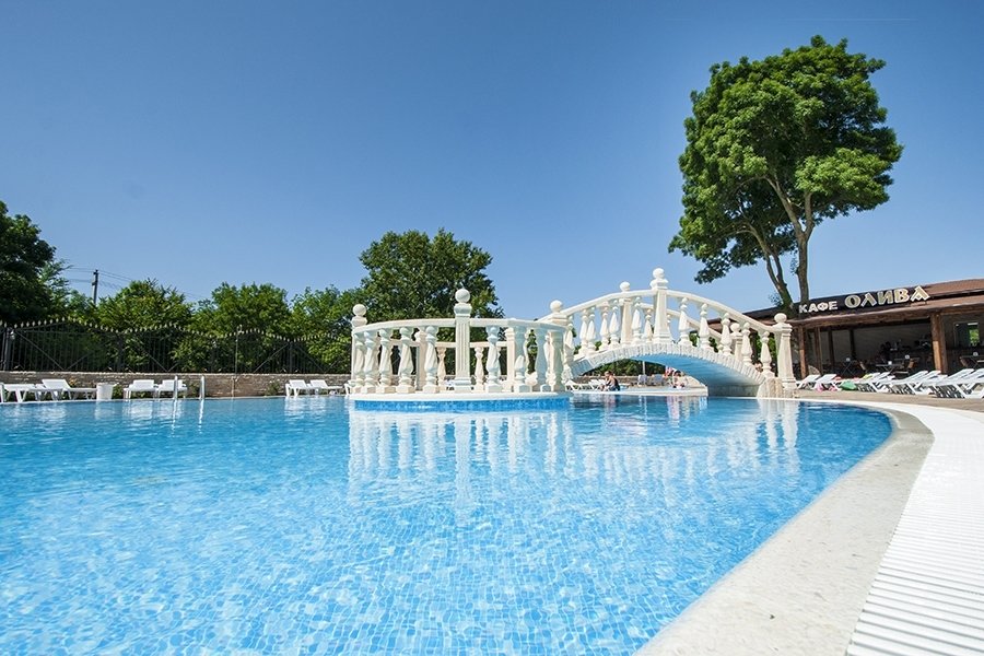 Просторный открытый бассейн оборудован декорированным мостиком, шезлонгами и зонтиками. Вода пресная, размер 20х10, шезлонги.
