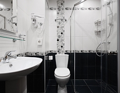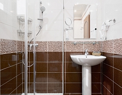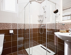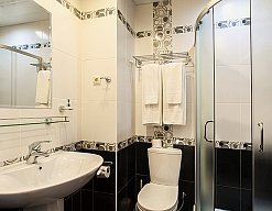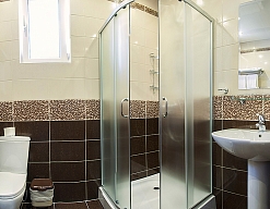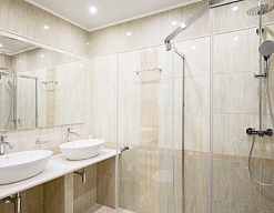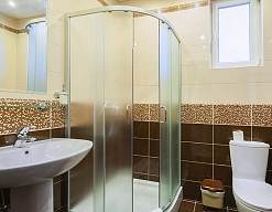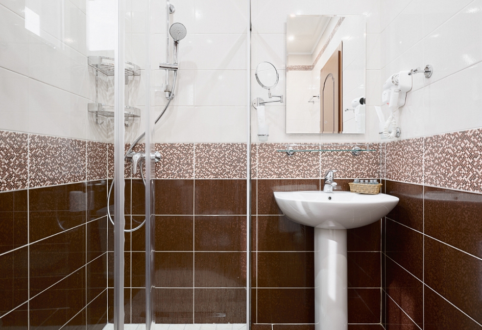 с душевой кабиной, тапочки, туалетные принадлежности, фен