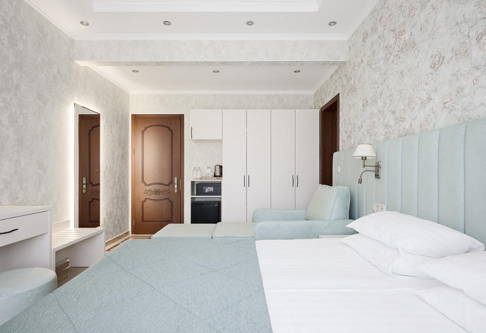 вешалка, зеркало, кровати односпальные /одна двуспальная кровать, кровать односпальная, прикроватные тумбочки, столик туалетный, стул, тумба багажная, шкаф
