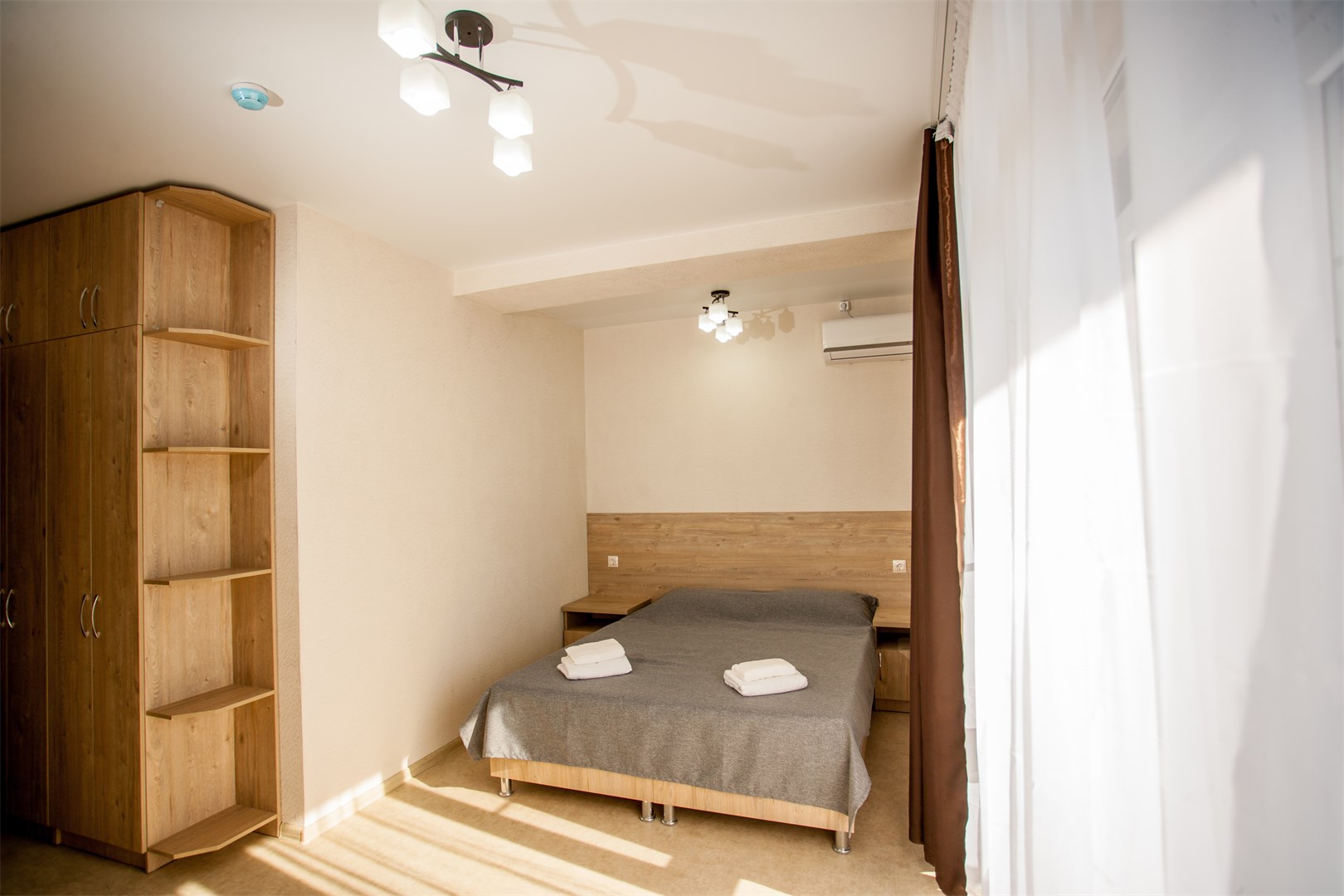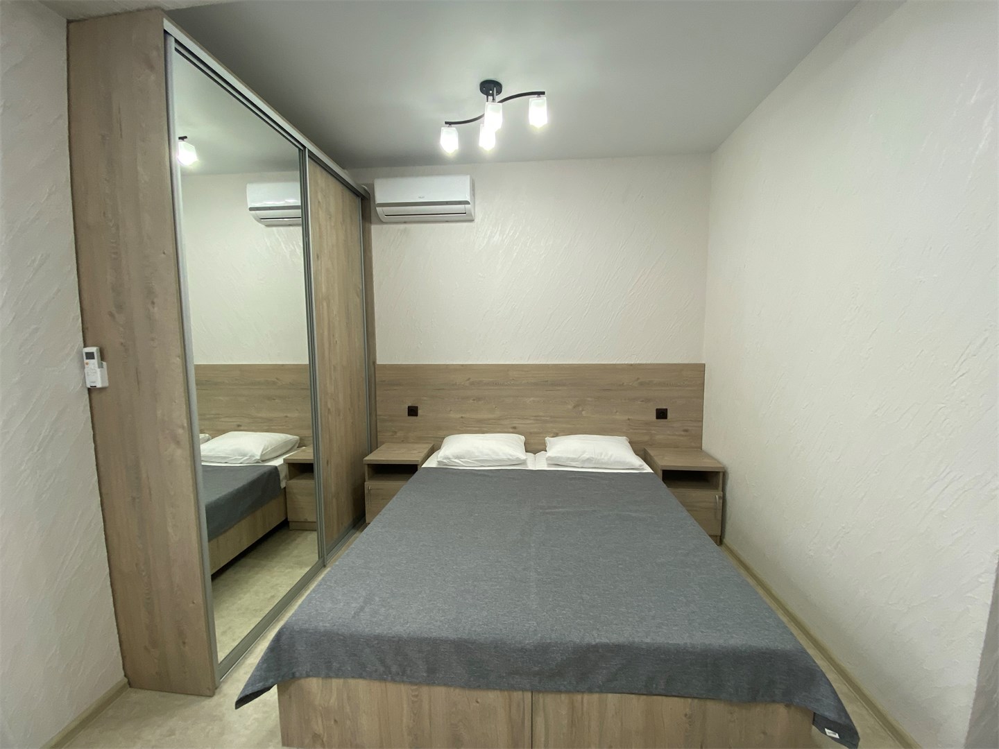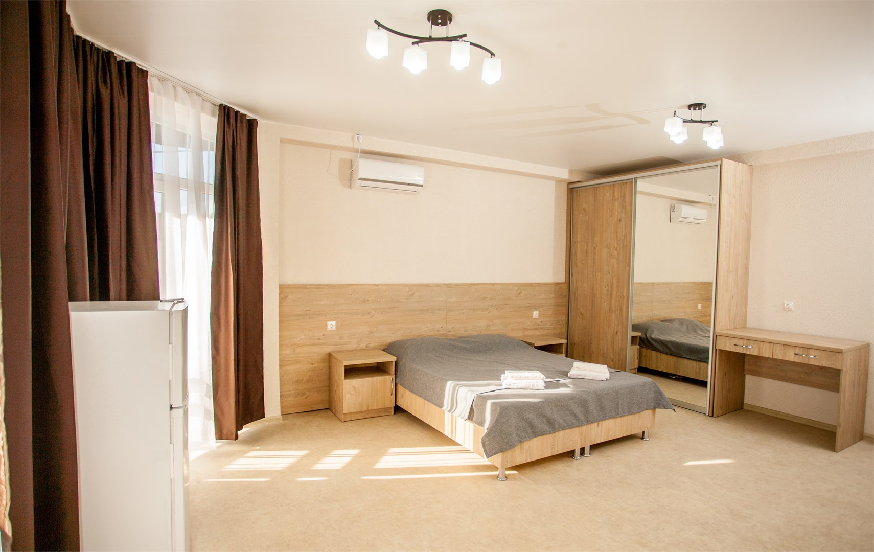 вешалка, зеркало, кровати односпальные, кровати односпальные /одна двуспальная кровать, прикроватные тумбочки, стол, стул, шкаф