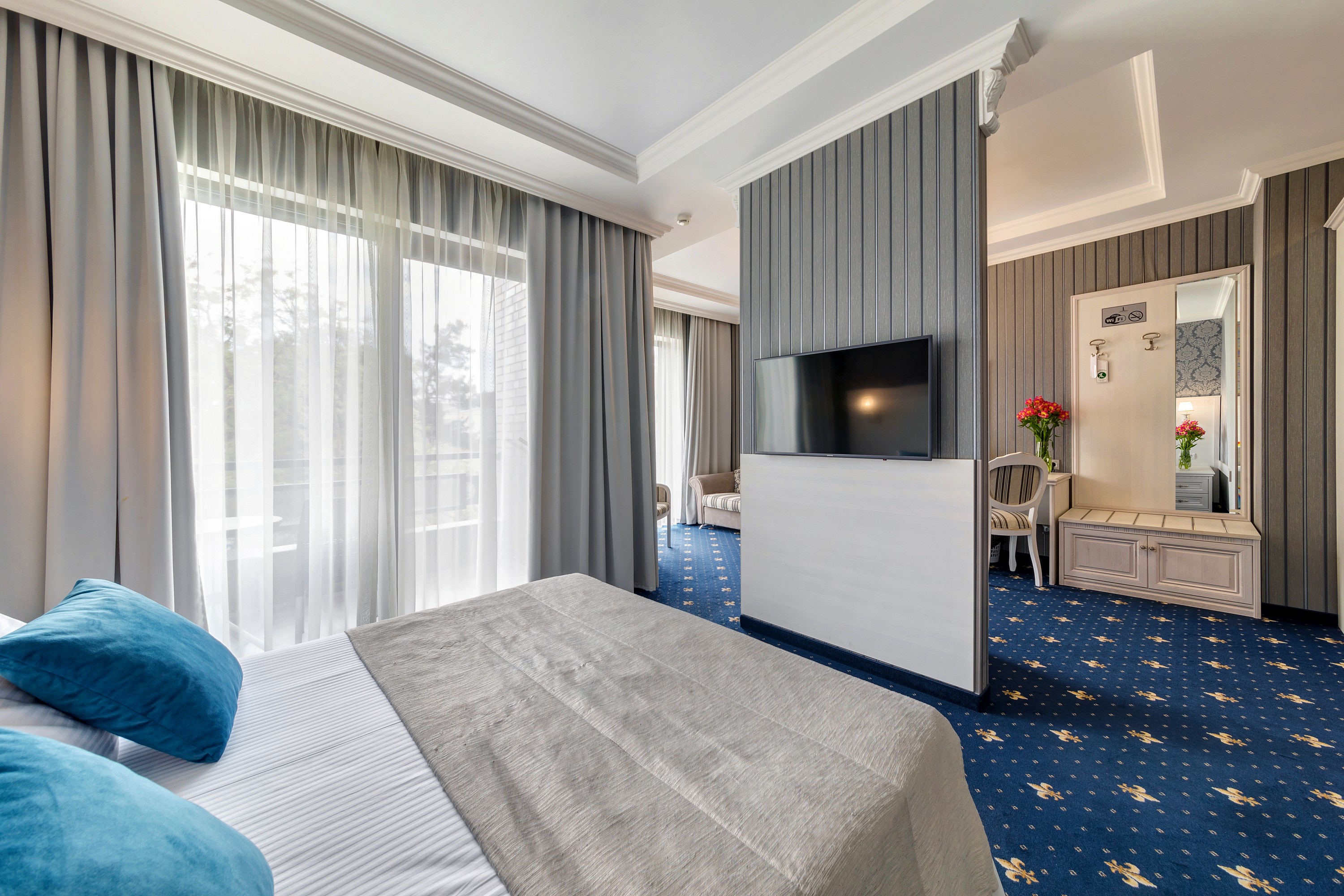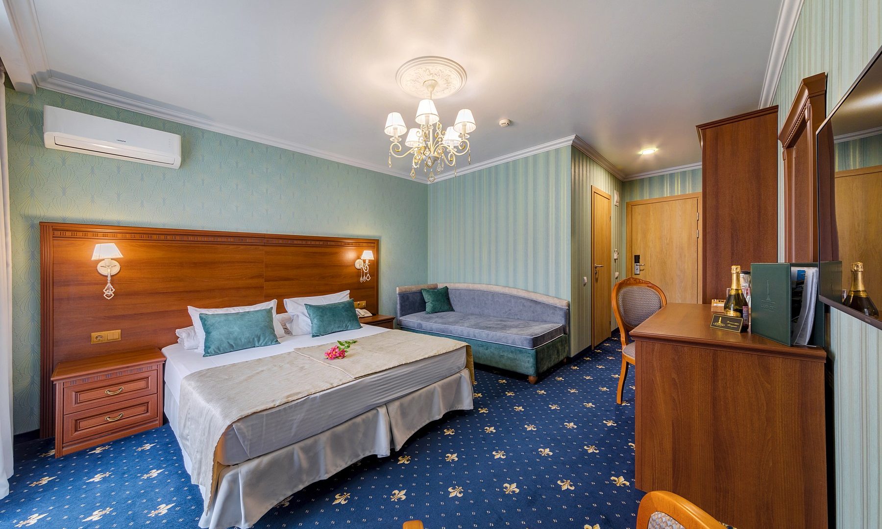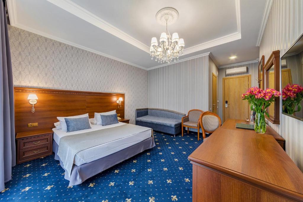 Большой номер. С новой комфортной мебелью. Отличный ремонт. В номере были все гигиенические принадлежности, халаты, каждый день в номер приносили воду. Идеальный удобный душ. Очень вкусные и обильные завтраки.