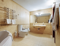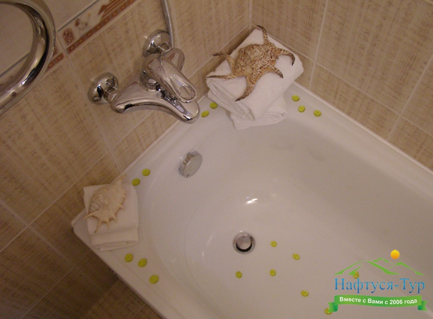 с ванной, тапочки, туалетные принадлежности, фен, халат