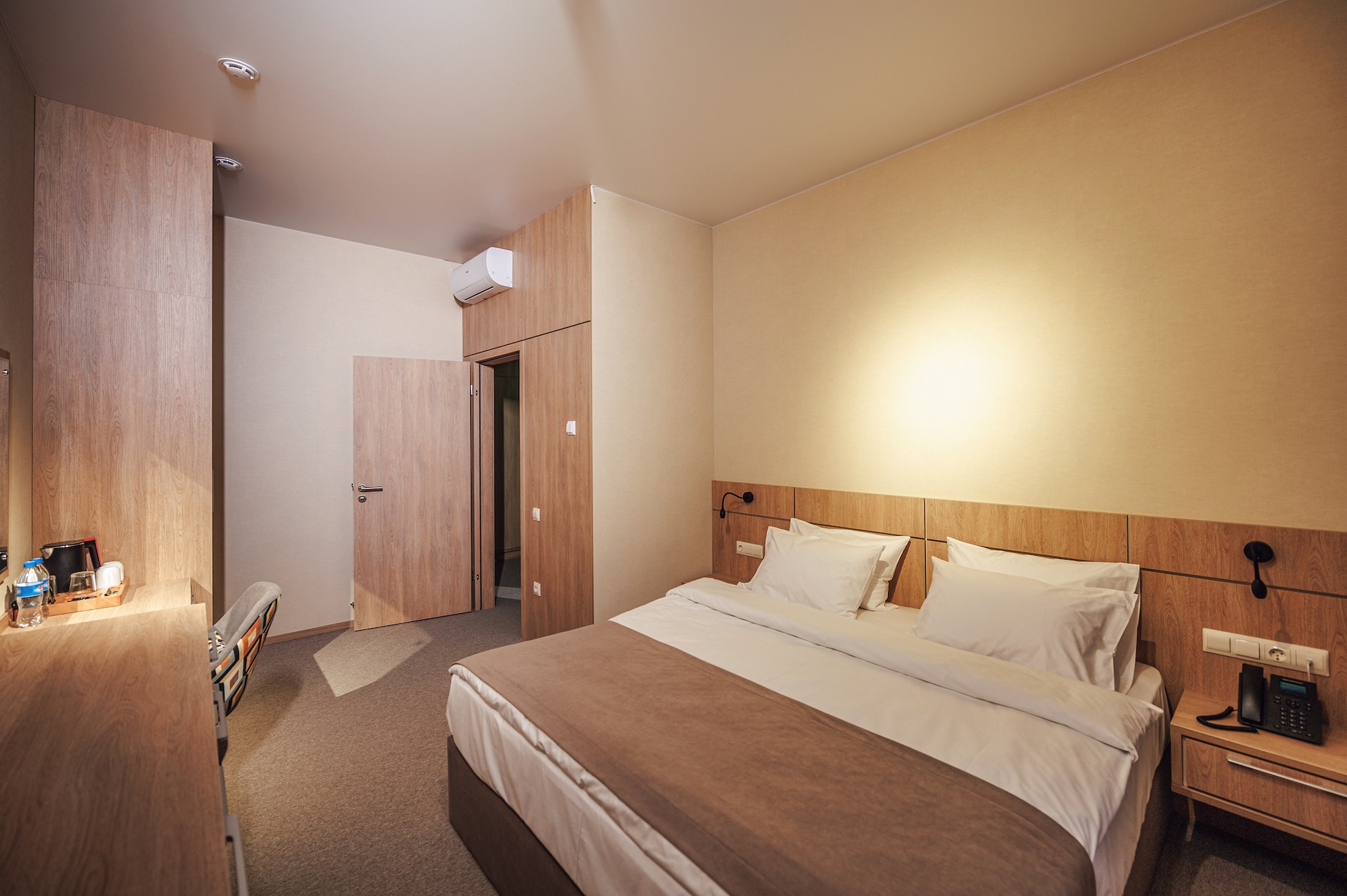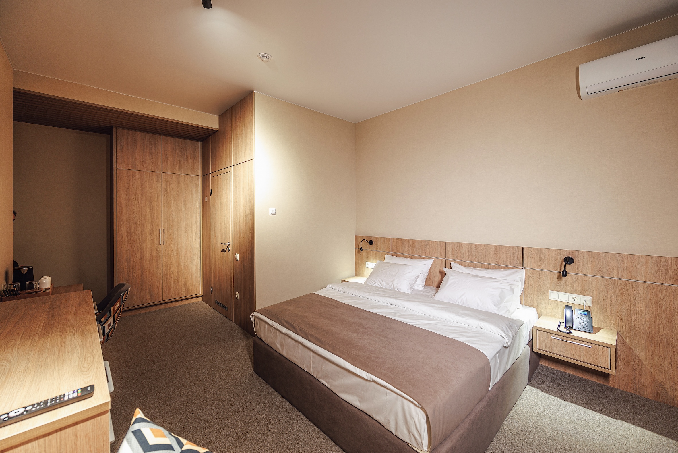 вешалка, зеркало, ковровое покрытие, кресло, кровать двуспальная, прикроватные тумбочки, стол, стул, шкаф