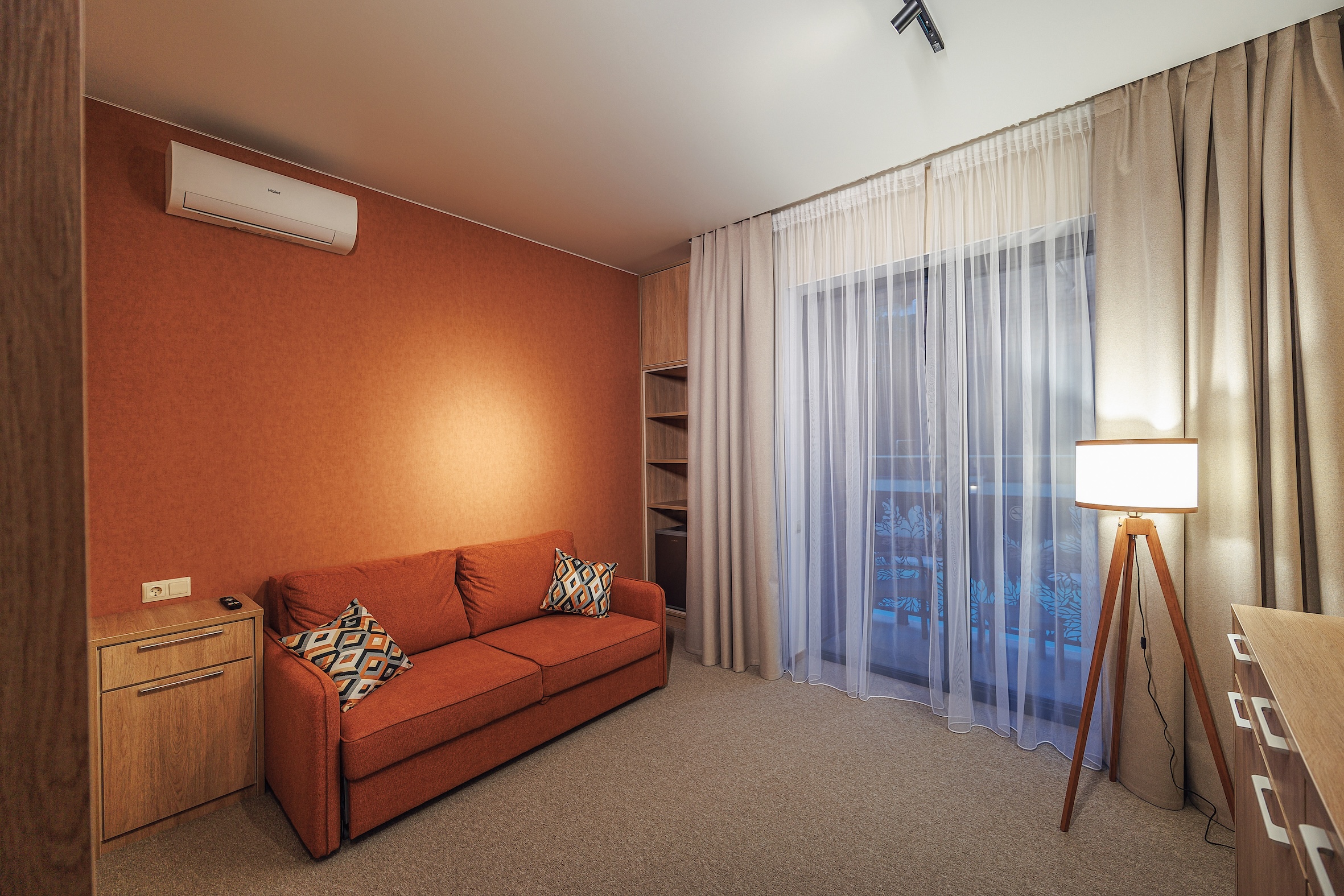 вешалка, диван раскладной, зеркало, ковровое покрытие, кресло, кровать двуспальная, прикроватные тумбочки, стол, столик журнальный, шкаф