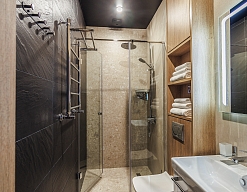 с душевой кабиной, туалетные принадлежности, фен