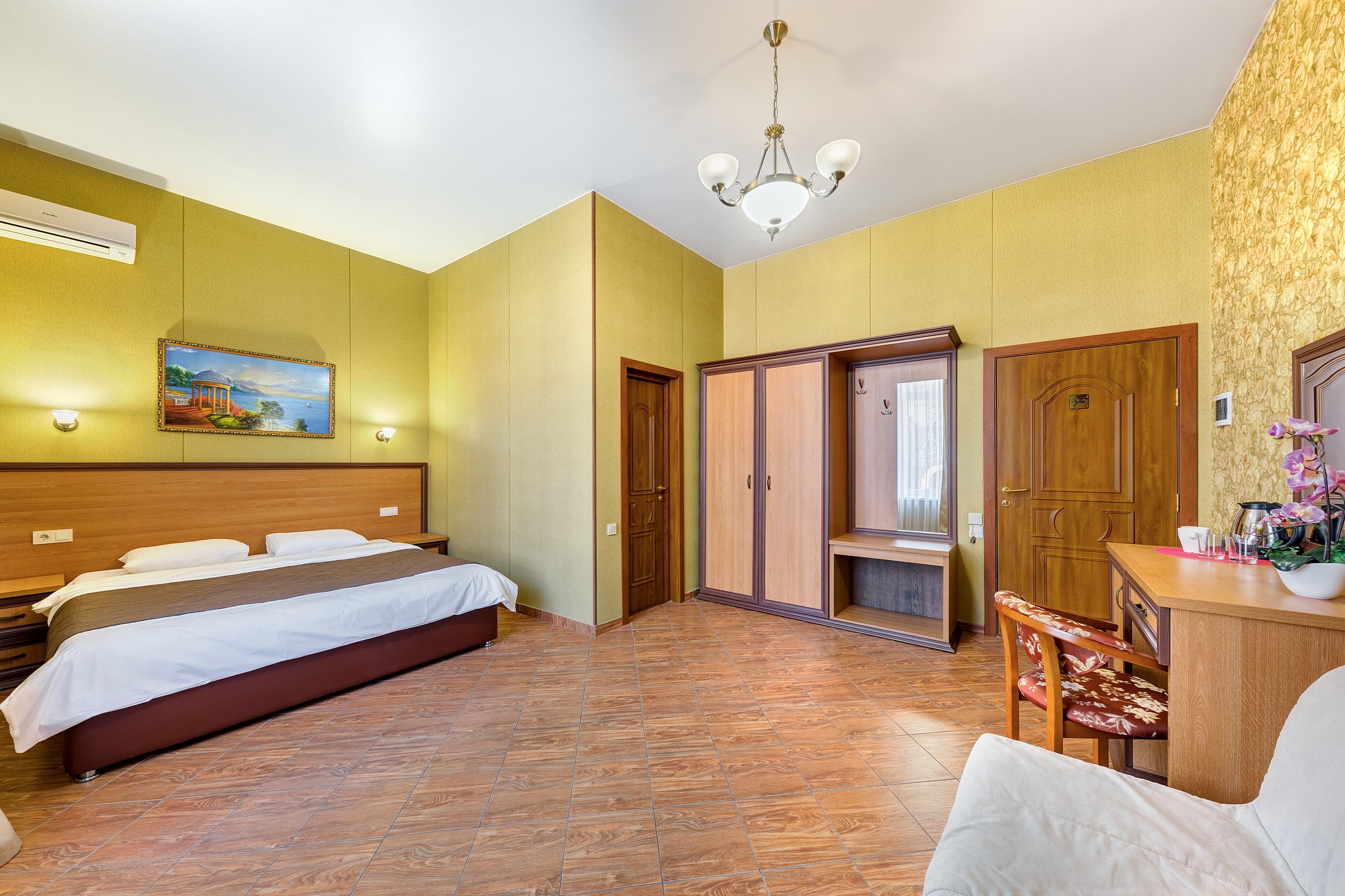 вешалка, зеркало, кровать двуспальная, прикроватные тумбочки, стол, стул, шкаф
