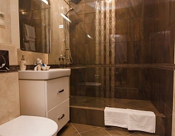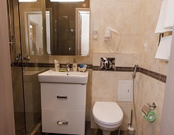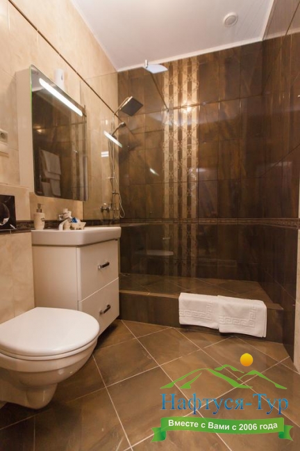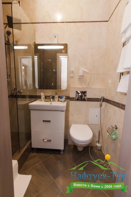 с душевой кабиной, тапочки, туалетные принадлежности, фен
