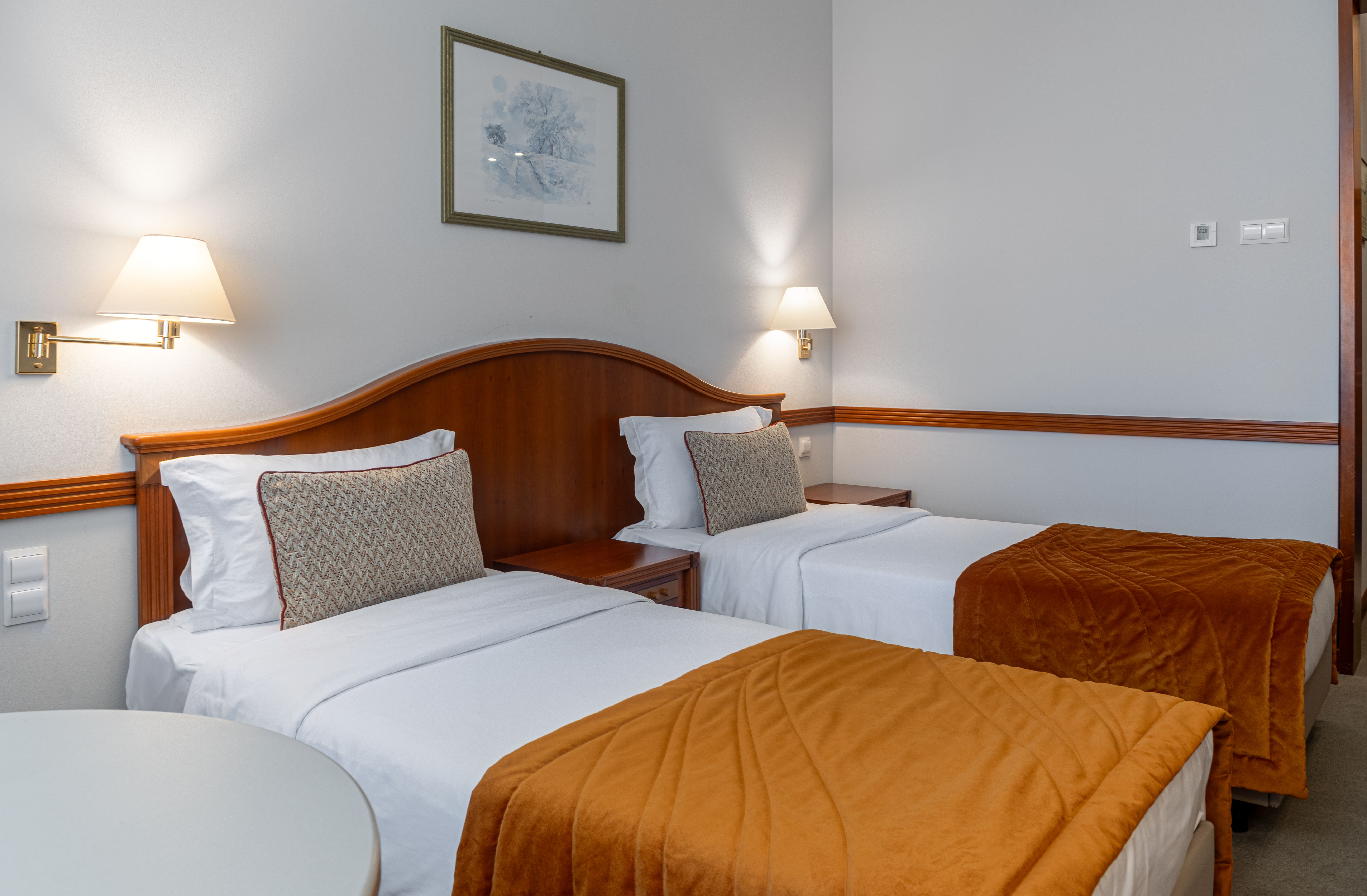 зеркало, кровати односпальные /одна двуспальная кровать, прикроватные тумбочки, стол, стул, шкаф