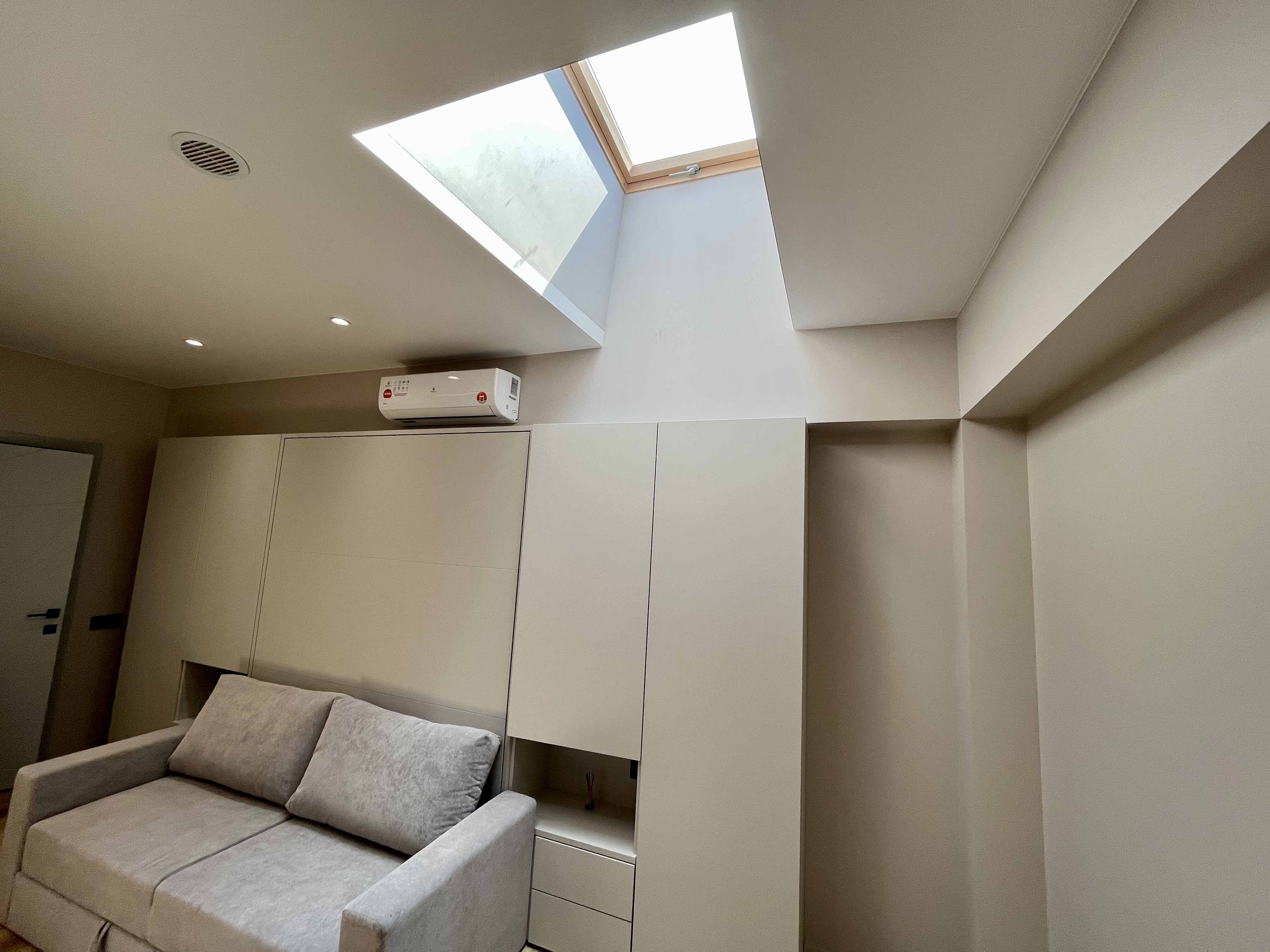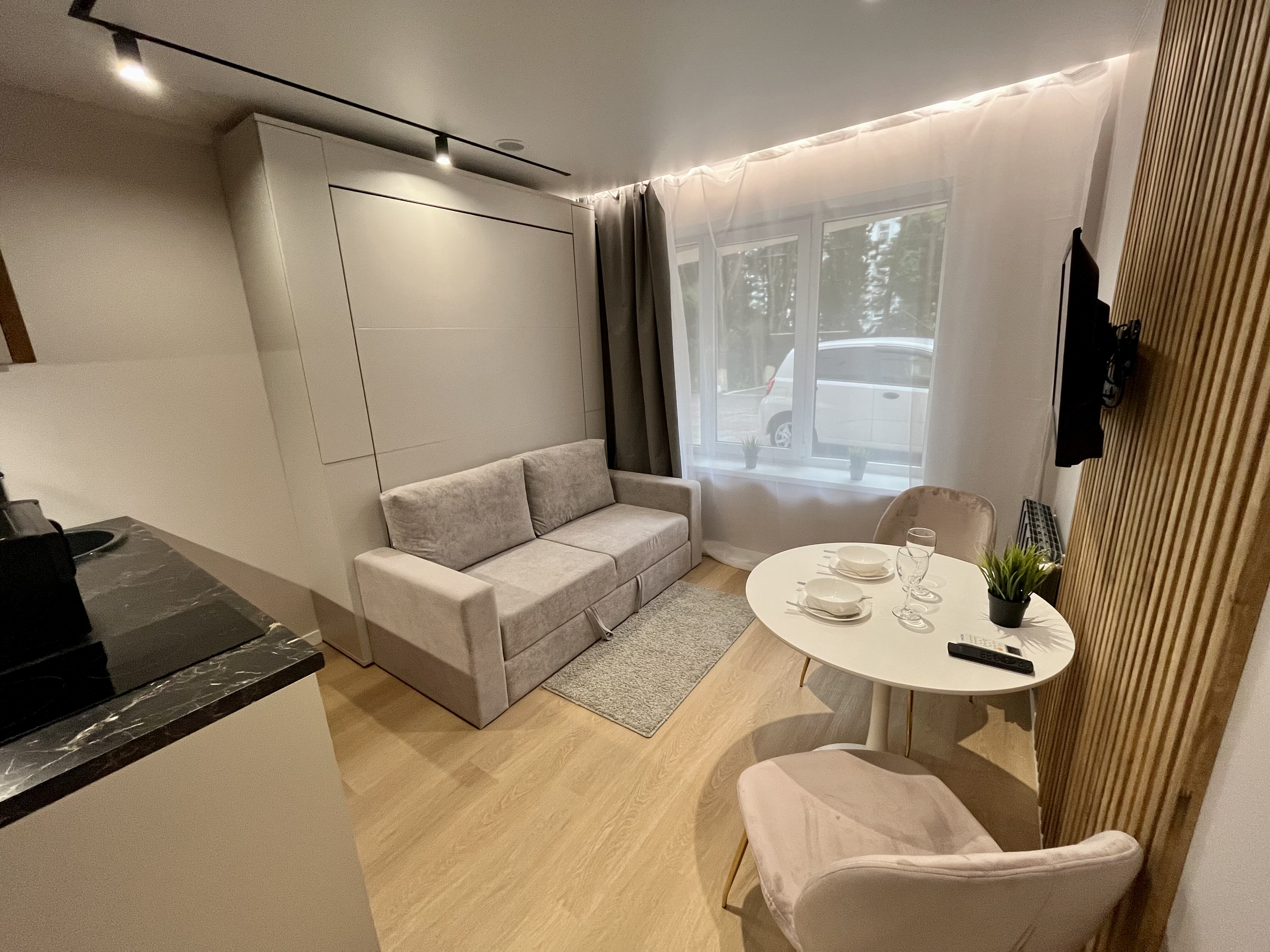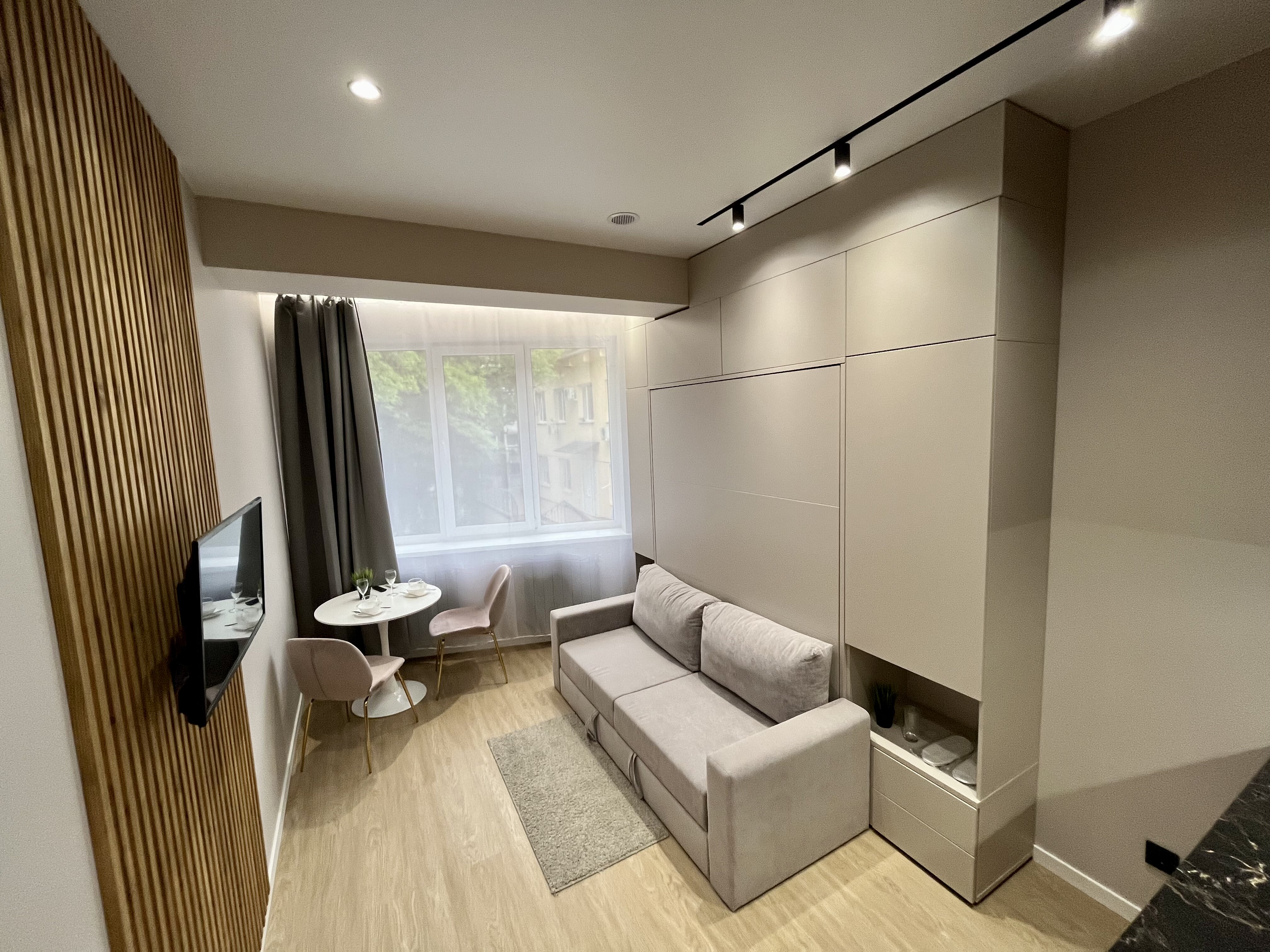 вешалка, диван раскладной, зеркало, стол, стулья, шкаф