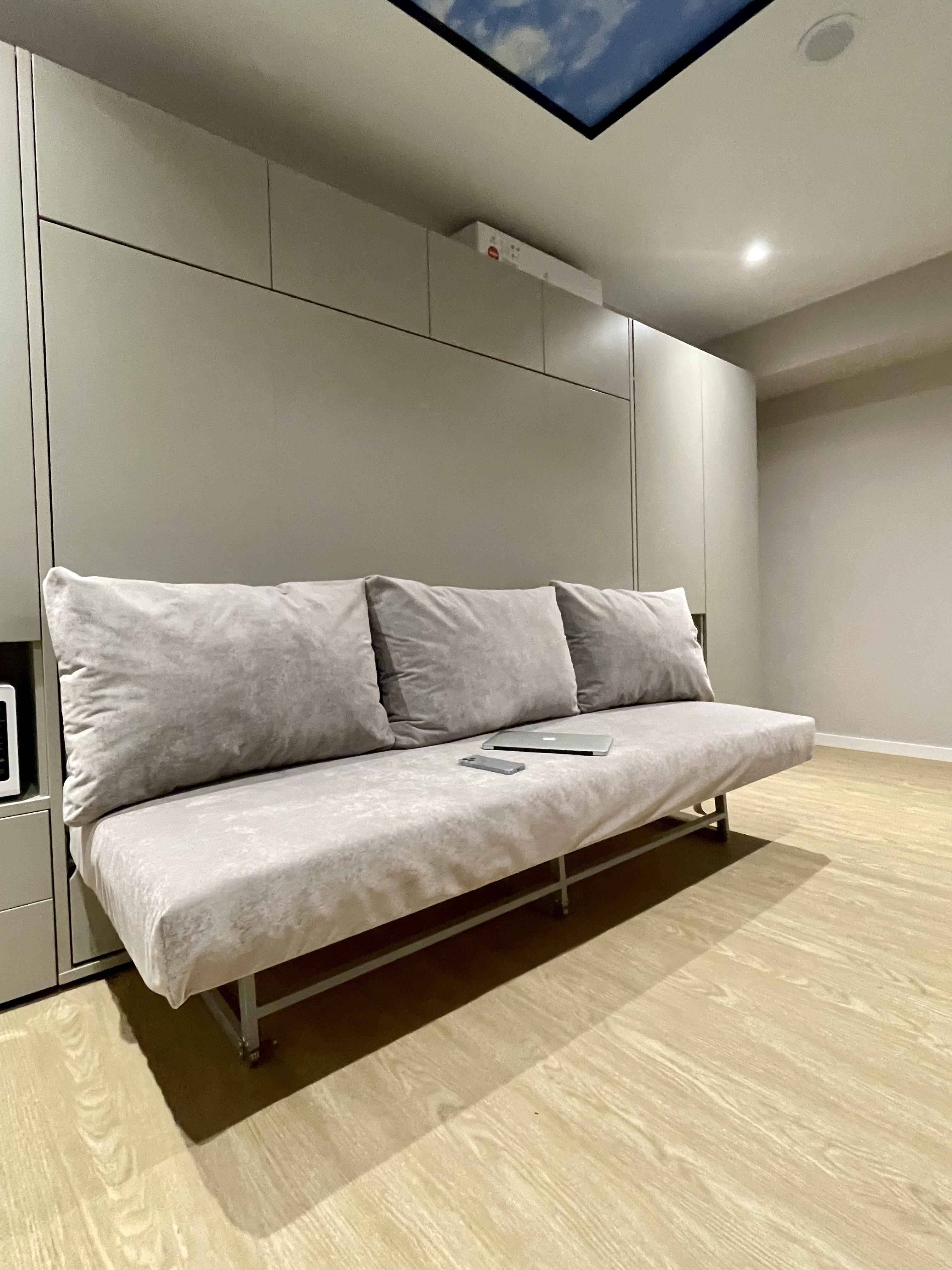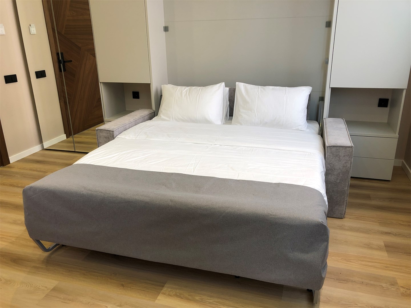 вешалка, диван раскладной, зеркало, прикроватные тумбочки, стол, стулья, шкаф