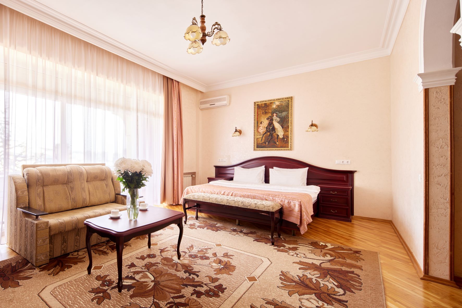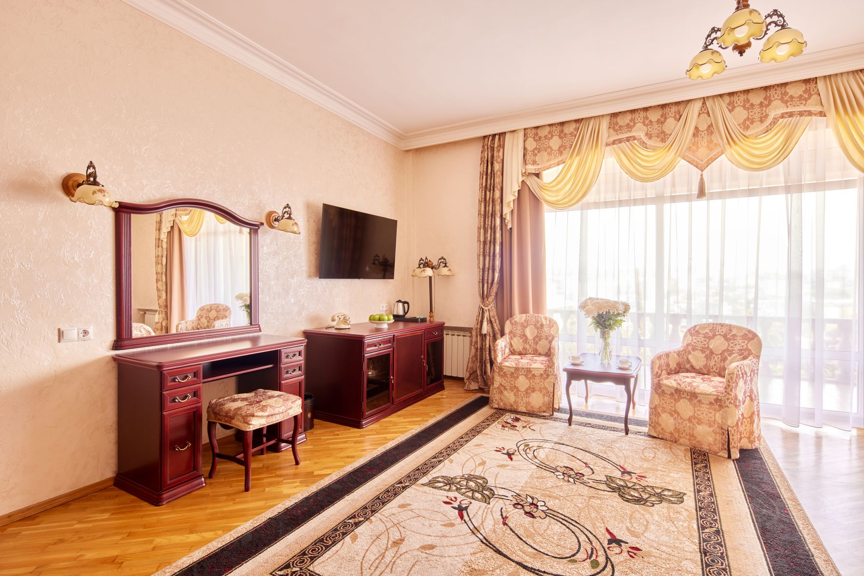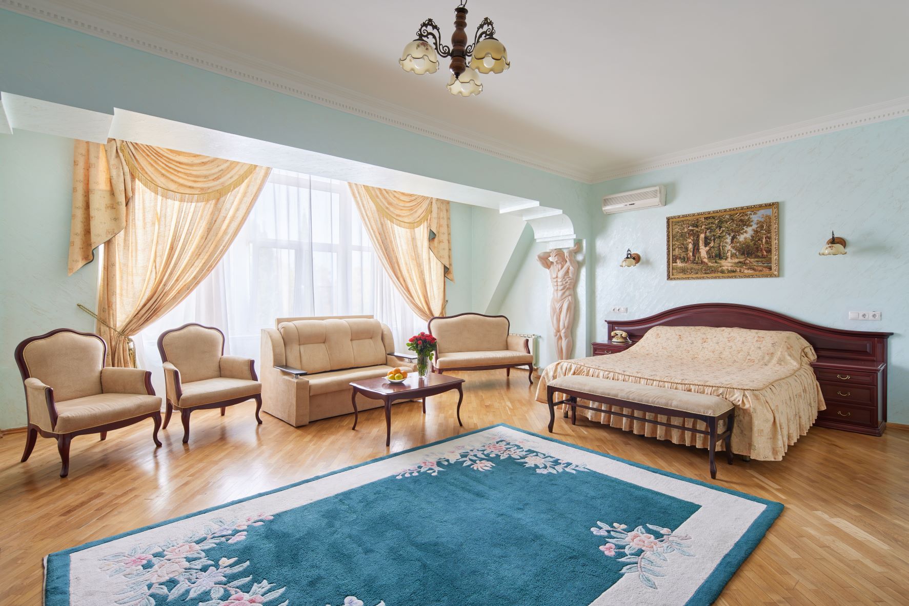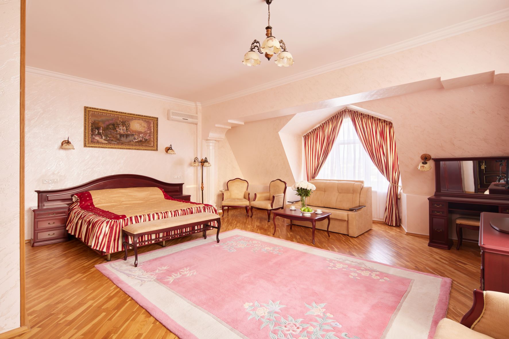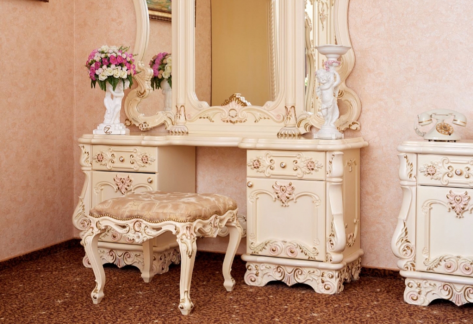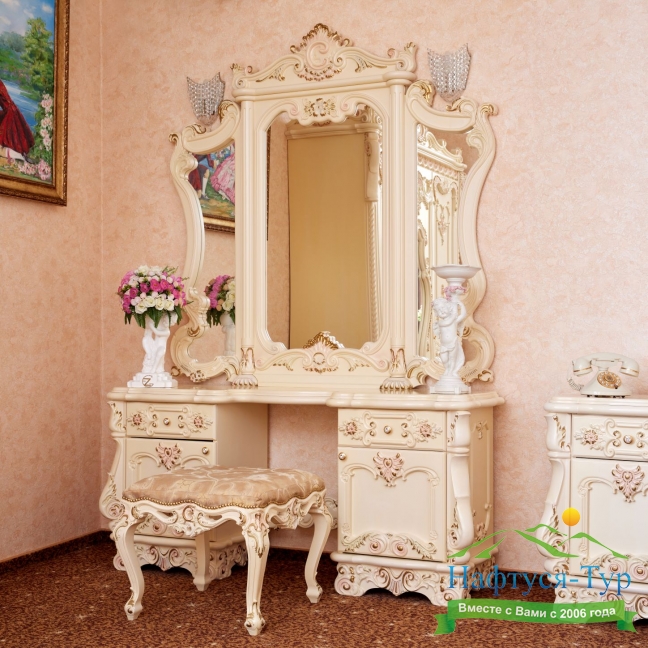 вешалка, диван, зеркало, кресло, кровать двуспальная, прикроватные тумбочки, столик журнальный, столик туалетный, шкаф