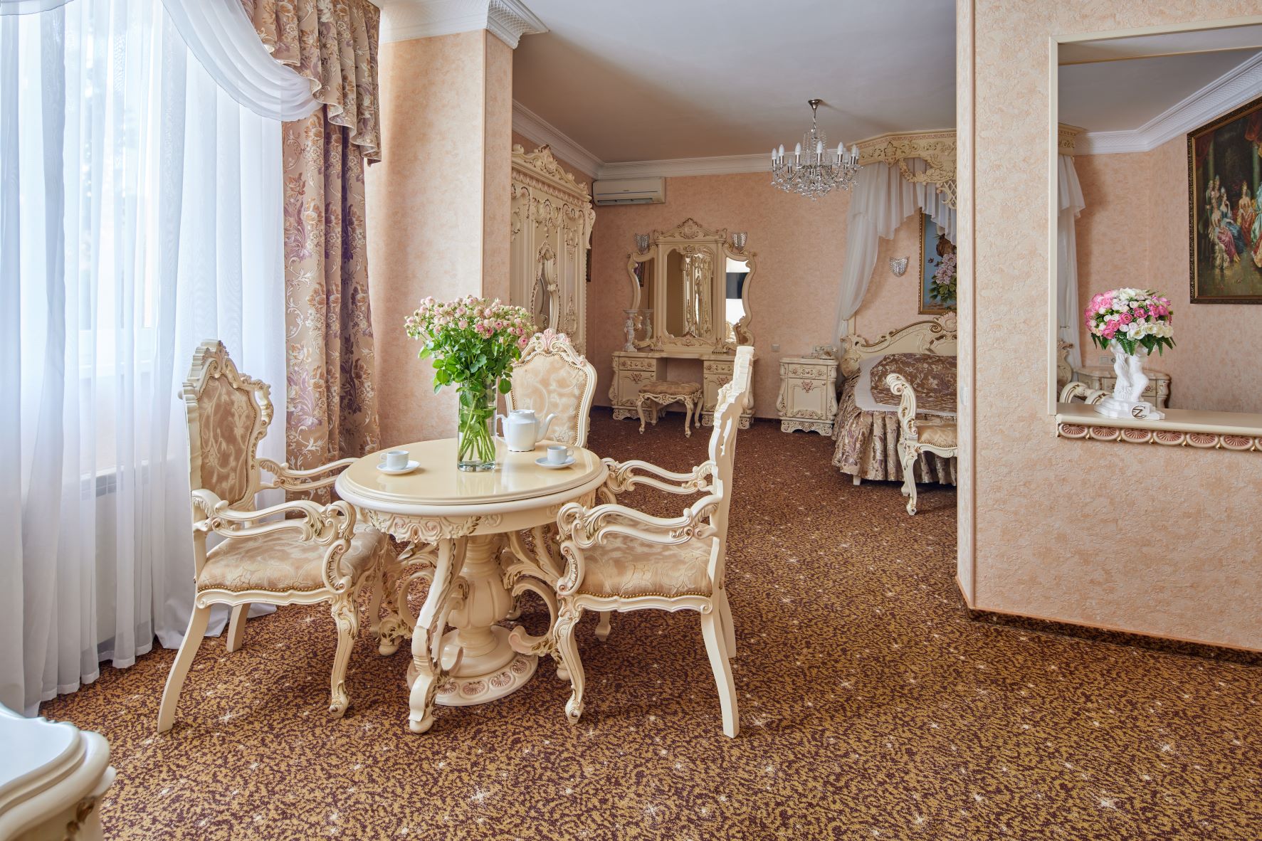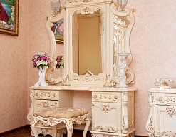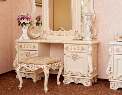 вешалка, зеркало, кресло, кровать двуспальная, прикроватные тумбочки, столик журнальный, столик туалетный, стул, шкаф