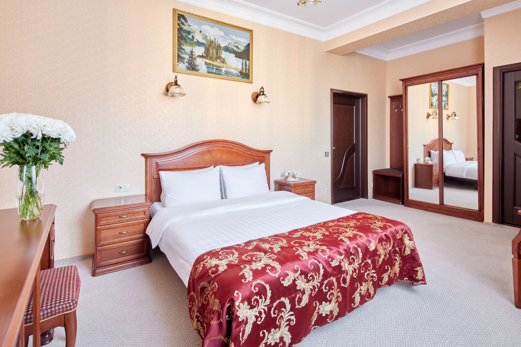 вешалка, зеркало, кровать двуспальная, стол, стулья, шкаф