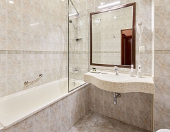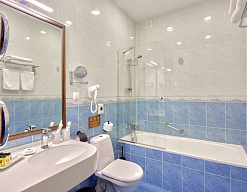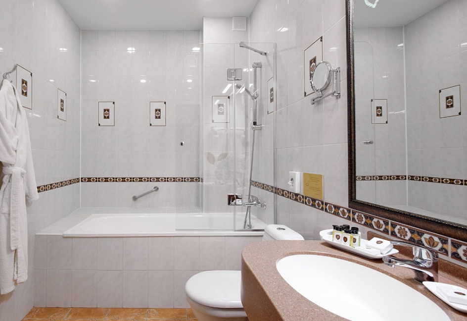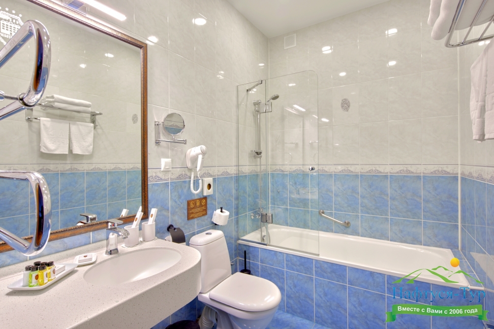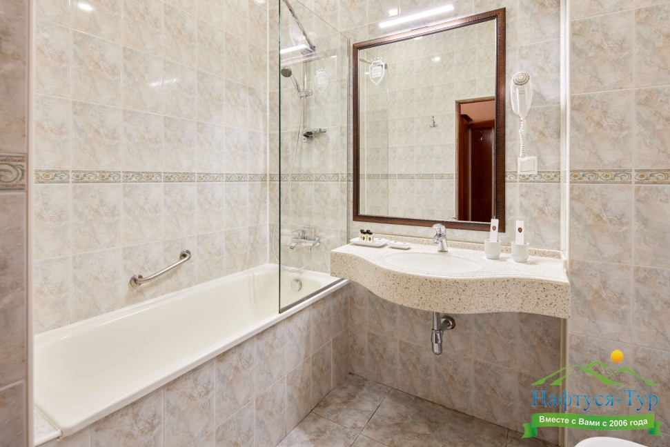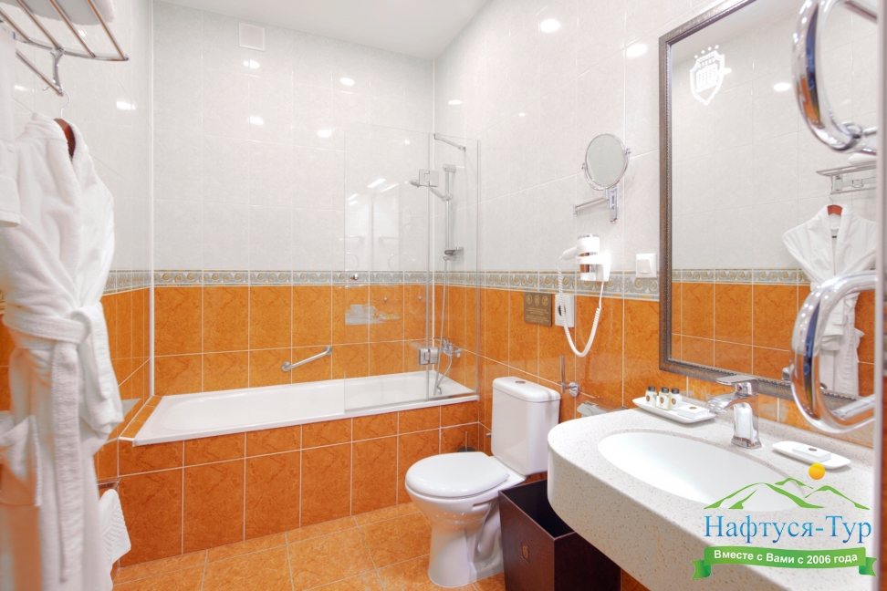 с ванной, тапочки, туалетные принадлежности, фен, халат