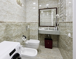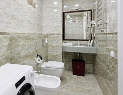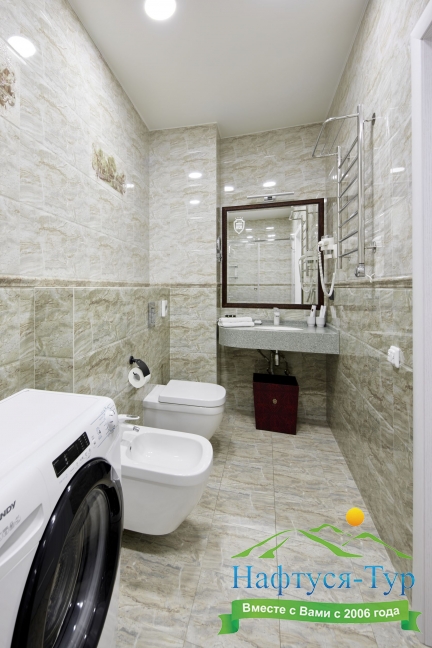 биде, с душевой кабиной, тапочки, туалетные принадлежности, фен, халат